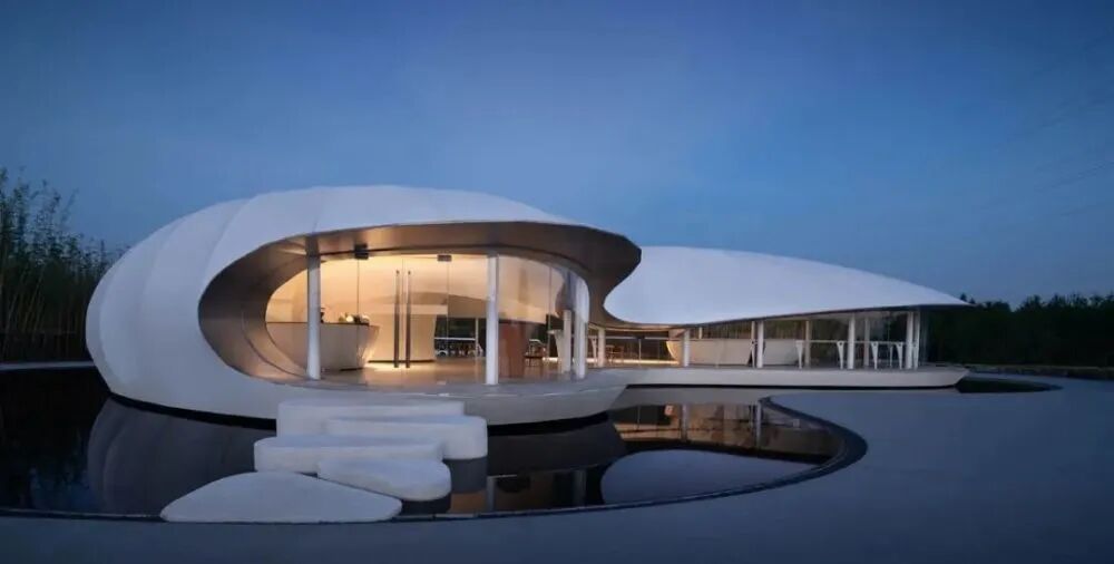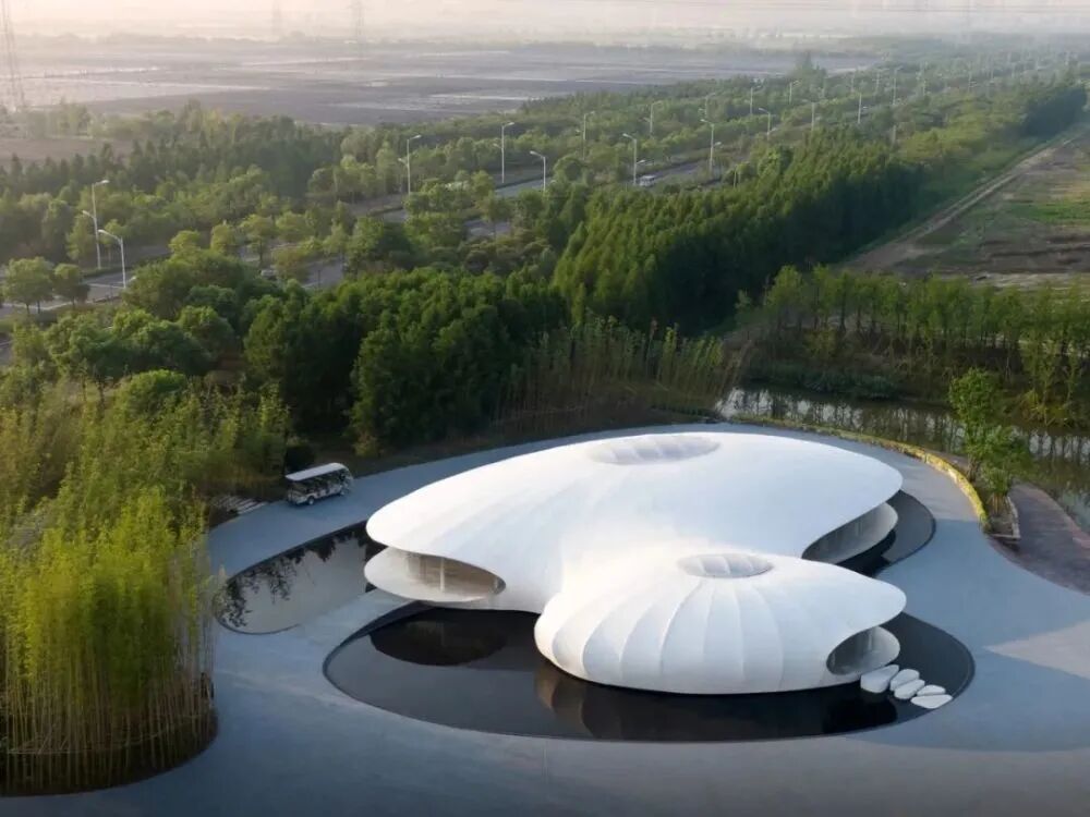 田园客厅展示中心采用膜结构的设计语汇,整体形态和质感既映射整个公园的主题,又表现为独特的空间和形态元素;整个建筑通过逐渐改变的内部高度营造不同的区域功能。