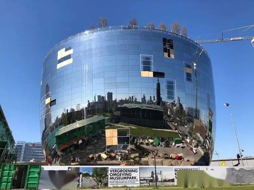 镜面的建筑表皮由1664块镜面玻璃拼贴而成,反光的立面可以反射周围各种的环境:来往的行人、博物馆公园的绿树成荫的地面、空中的流云和鹿特丹充满活力的城市天际线