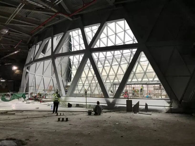 在他的外观上,我们可以清楚的看见独特的斜纹钢和玻璃屋顶,整个建筑由超过9000片专门定制的玻璃、近18000根钢梁和超过6000个铸钢节点组成。
