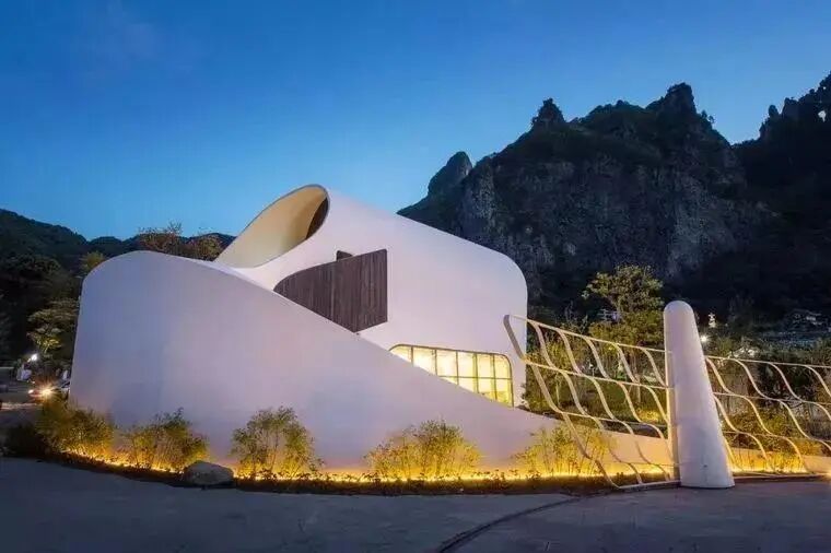 远远望去,这家酒店犹如一艘即将起航的帆船白色极简的外观,行云流水的线条,将现代设计与自然景观做了完美融合,仿佛瞬间将我们带入到一个静谧而诗意的世界。