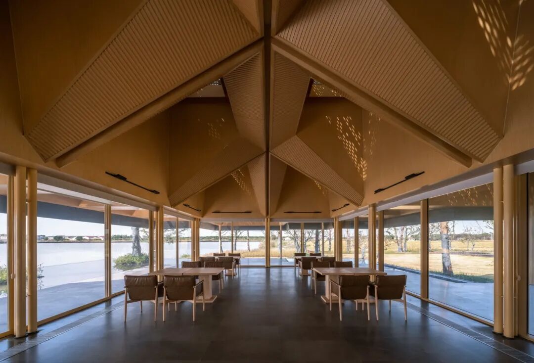 屋顶檐口被统一压低在2.7米。站在檐下向外观赏,平原湿地的广阔与静谧如同被收入画卷之中。为强调屋顶的悬浮效果,建筑的承重柱在满足承重的基础上尽可能缩减尺度。