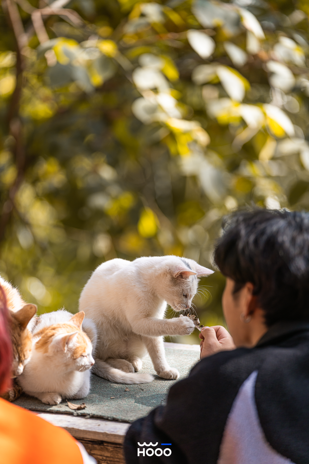 亭子里的猫粮、猫咪们喝的饮用水,靠他们每天午饭后人肉背上来。他们也会趁这个时候,跟过路的游客讨一下善缘,好给猫们吃饭、治病、绝育。