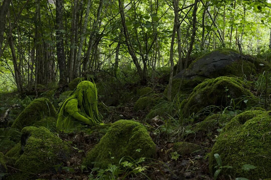 在如同冰雪王国的北欧,基姆·西蒙森不玩雪,却爱上了玩土,这是不是也挺不可思议?虽然玩的是土,但这位艺术家却用粘土做出了类似苔藓的效果,他创作的真人大小的儿童雕塑,全身仿佛被覆盖着绿色的苔藓,被放置在自然环境中,带给人一种独特的观感。