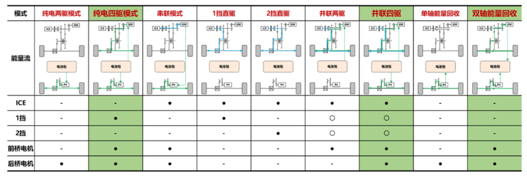 先说它的低能耗,全新Hi4的发动机+前桥电机+后桥电机组合能够实现9种驱动模式,包括纯电两驱、纯电四驱、串联模式、1挡直驱、2挡直驱、并联两驱、并联四驱、单轴能量回收、双轴能量回收。