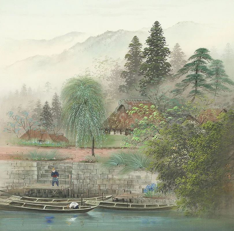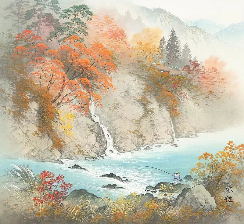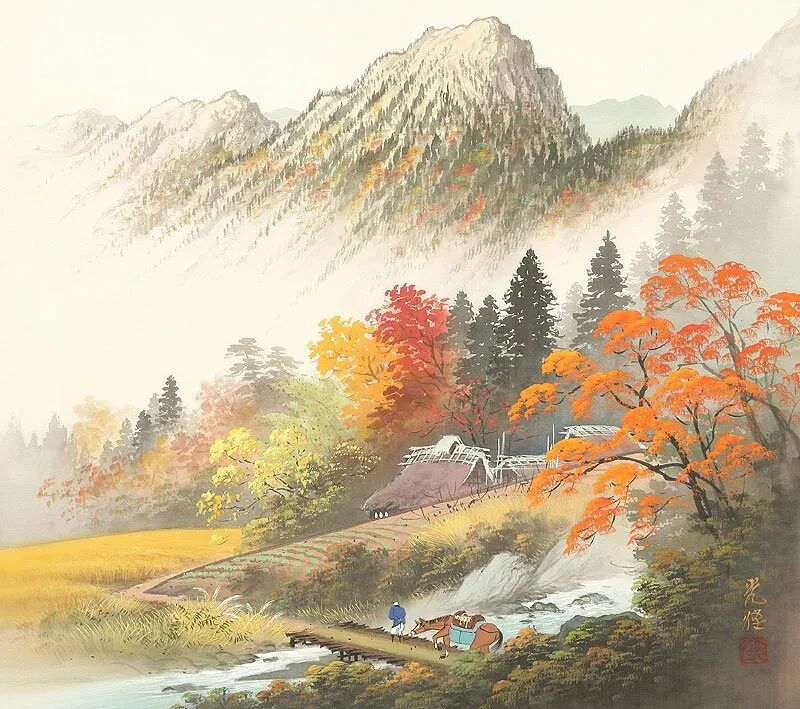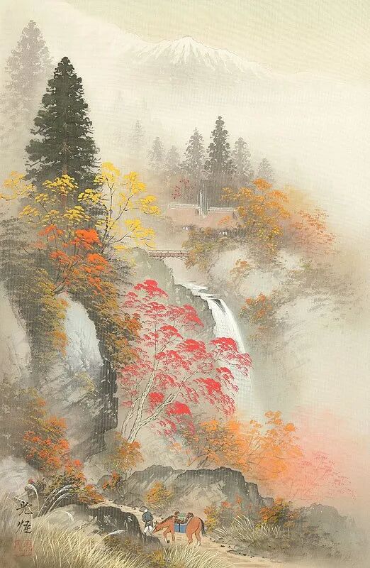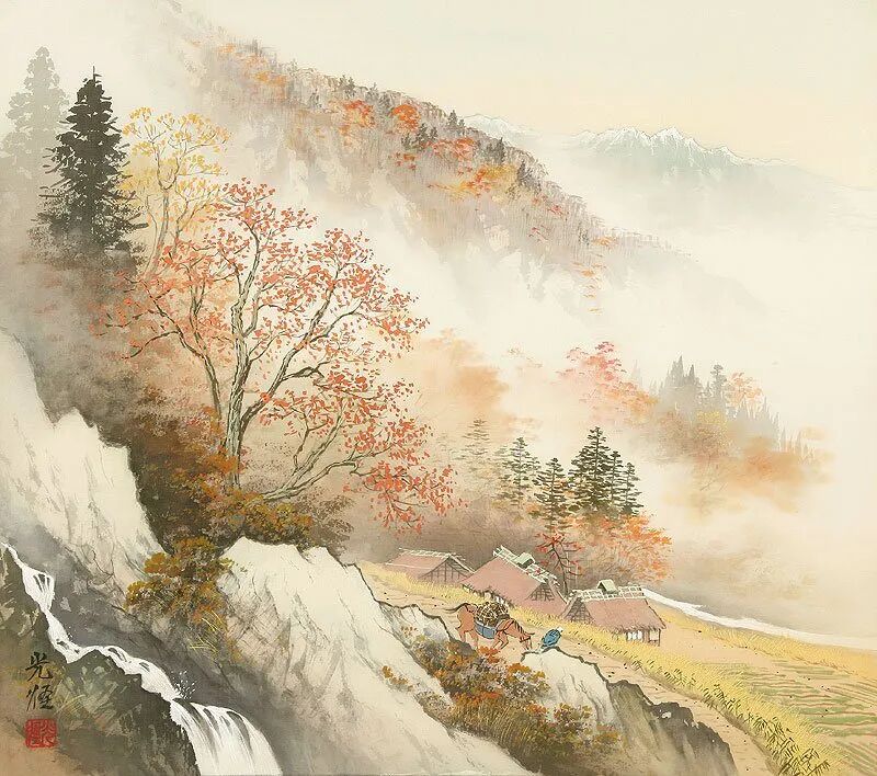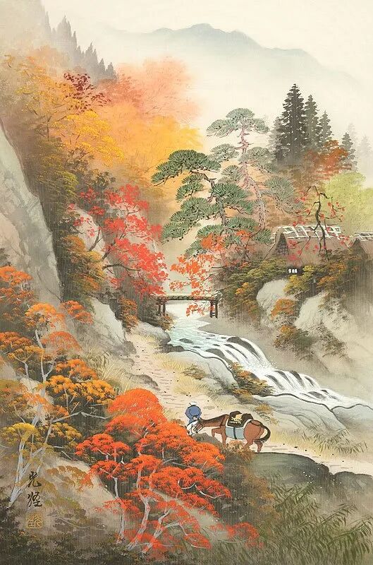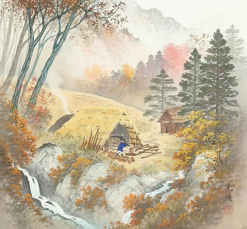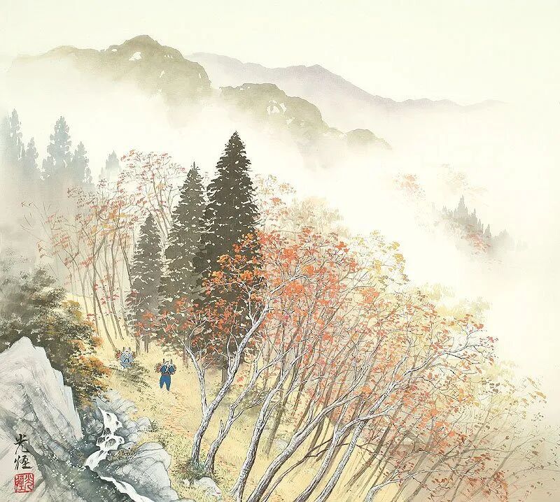 小岛光径(Koukei Kojima)笔下的风景与山色呈现出一种诗一般的意境,作者以干炼的笔墨,勾画出一幅幅美妙,人与自然和谐融合的古朴景象,画面生动而从容闲适。注视这一幅福迷蒙山色,真有林壑尤美,蔚然而深秀之感。