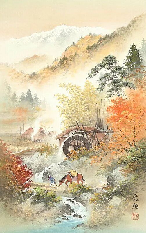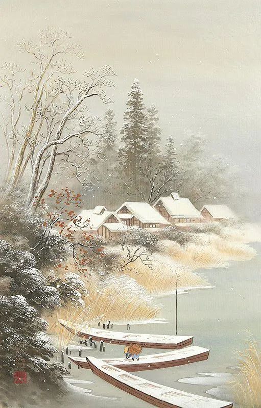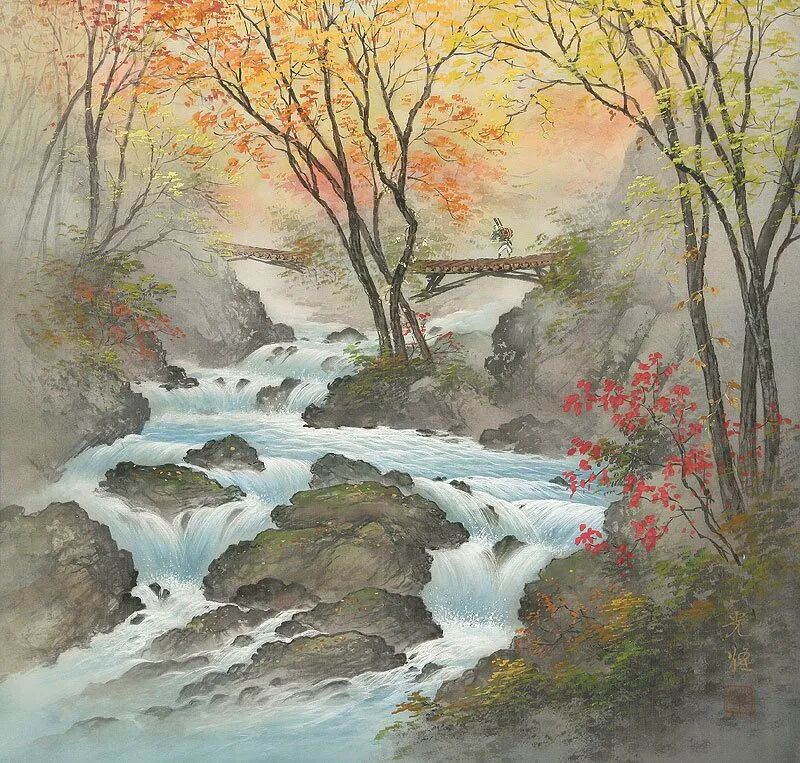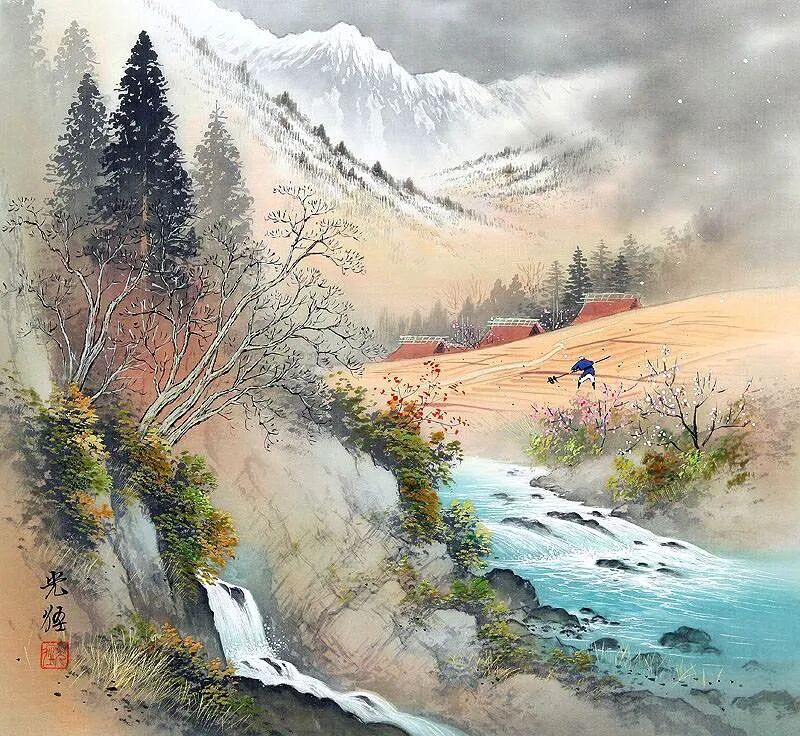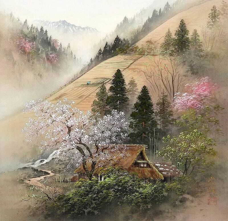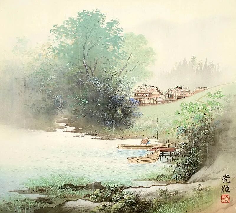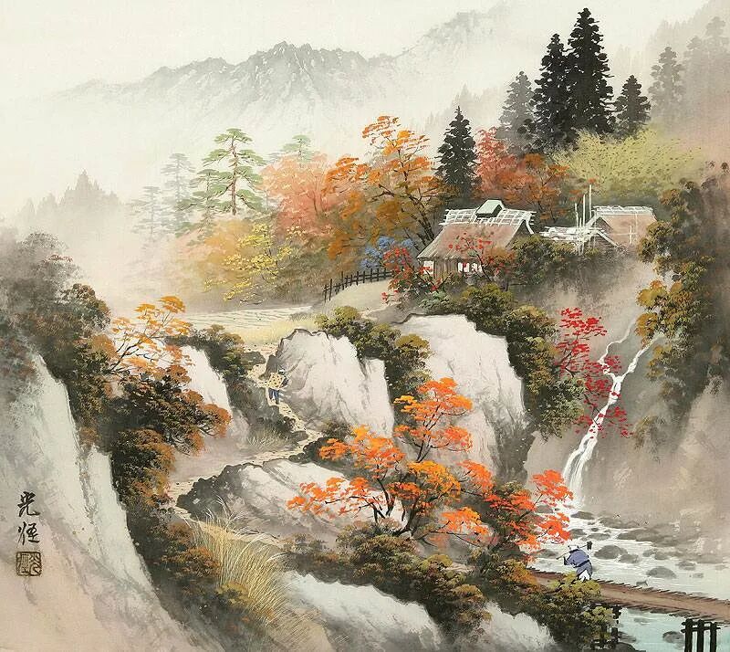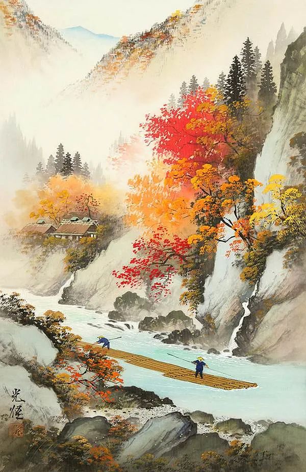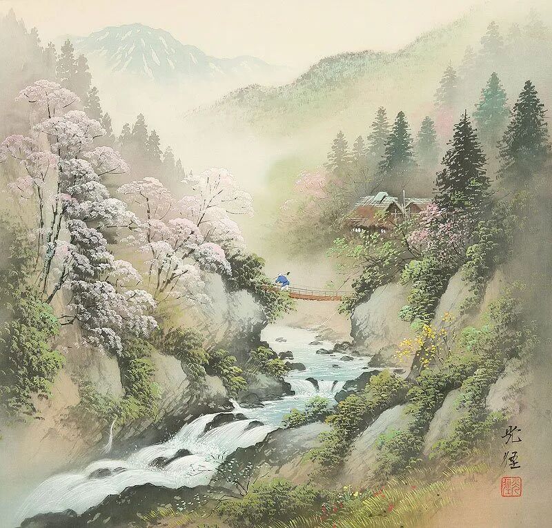 小岛光径(Koukei Kojima)笔下的风景与山色呈现出一种诗一般的意境,作者以干炼的笔墨,勾画出一幅幅美妙,人与自然和谐融合的古朴景象,画面生动而从容闲适。注视这一幅福迷蒙山色,真有林壑尤美,蔚然而深秀之感。