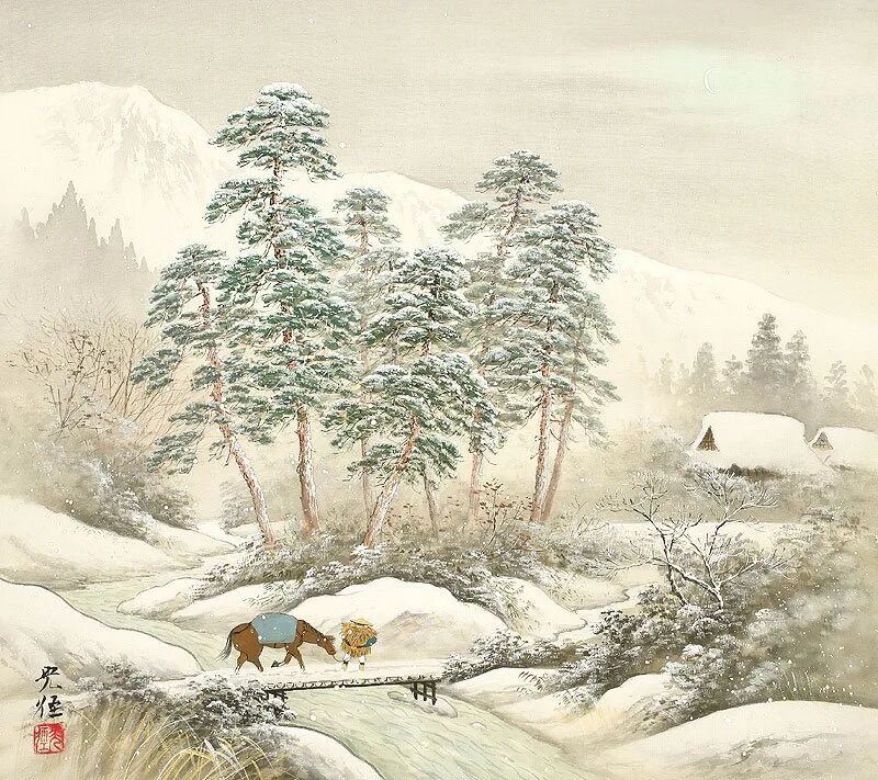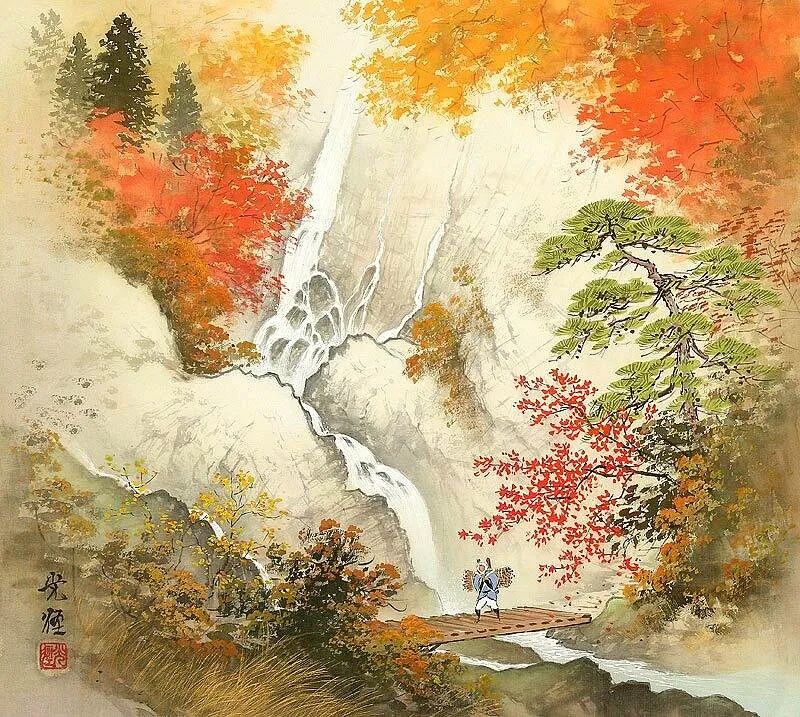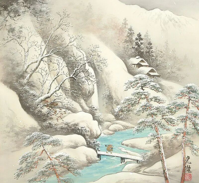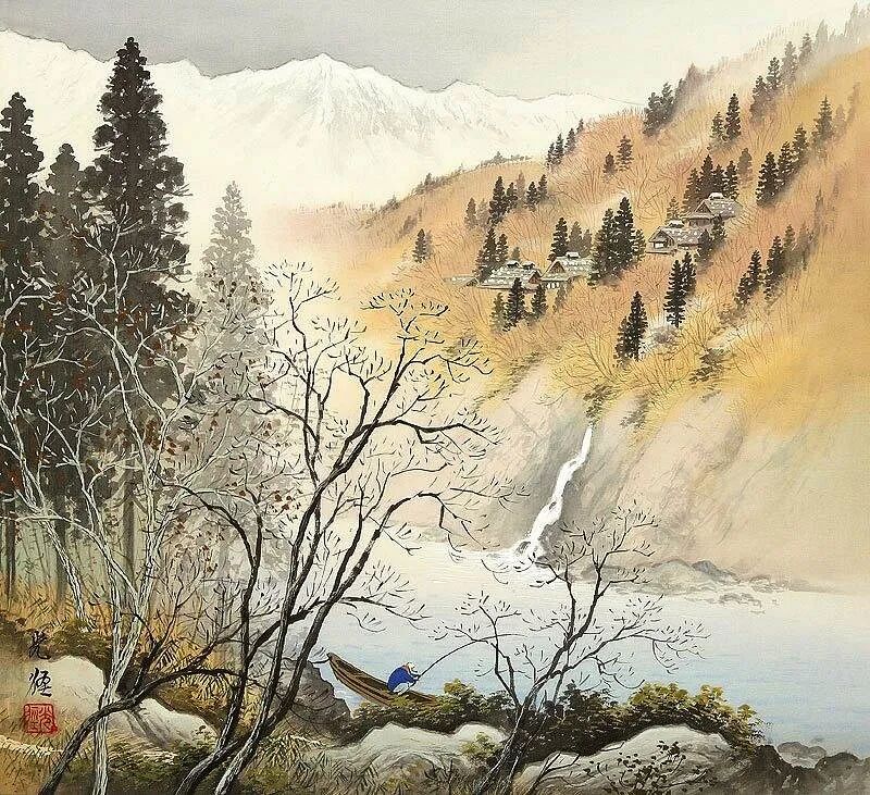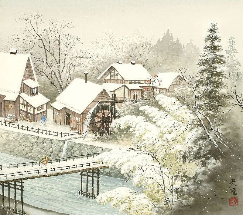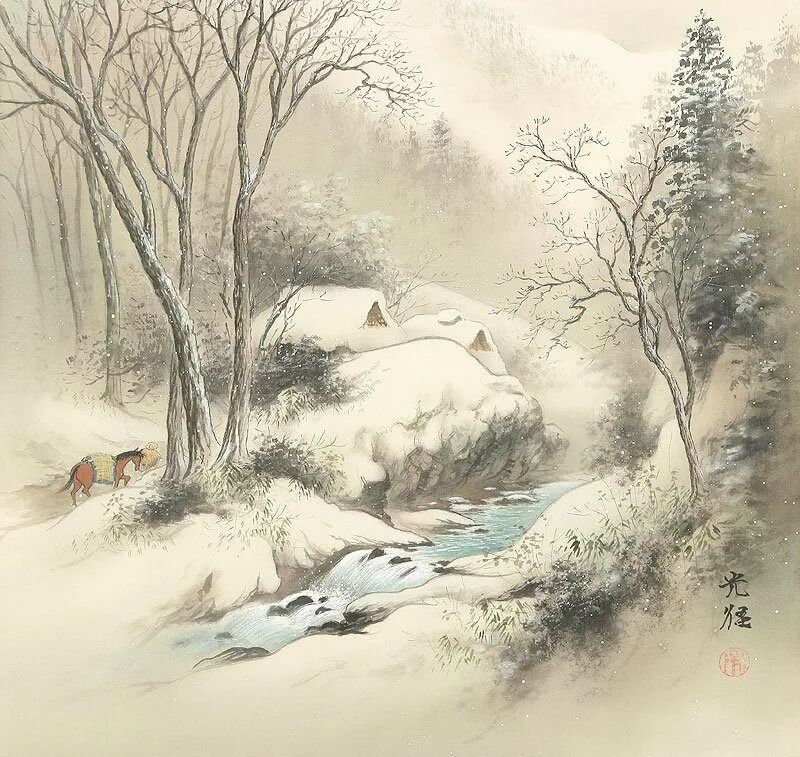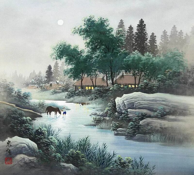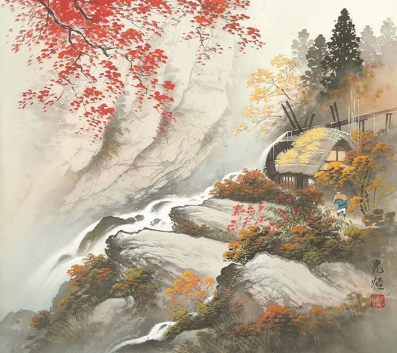 小岛光径(Koukei Kojima)笔下的风景与山色呈现出一种诗一般的意境,作者以干炼的笔墨,勾画出一幅幅美妙,人与自然和谐融合的古朴景象,画面生动而从容闲适。注视这一幅福迷蒙山色,真有林壑尤美,蔚然而深秀之感。