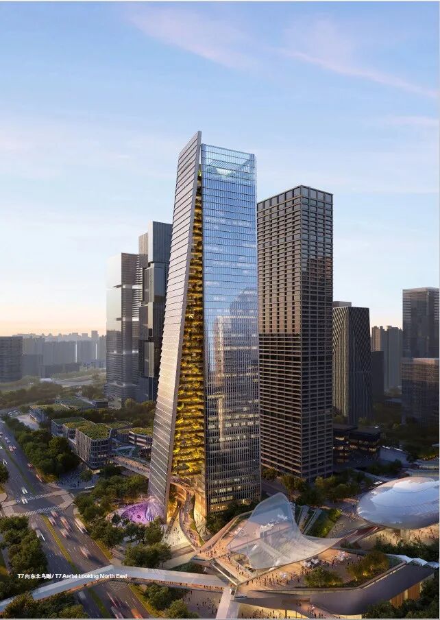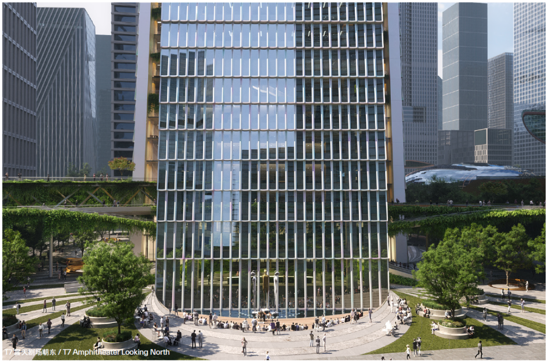 T7为250米超甲级办公楼,地上建筑面积约10.1万平方米。核心筒和结构设计适应功能完善的地下空间和规划的轨道路线,结构以创新方式减少复杂结构转换来避让轨道线路,建筑通过轻度扭转并与结构高度融合形成向下扩展,顶部逐渐变细的体量,减轻风荷载并节省成本,提高稳定性。