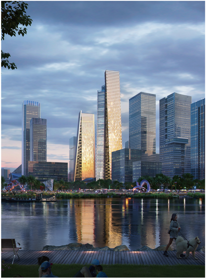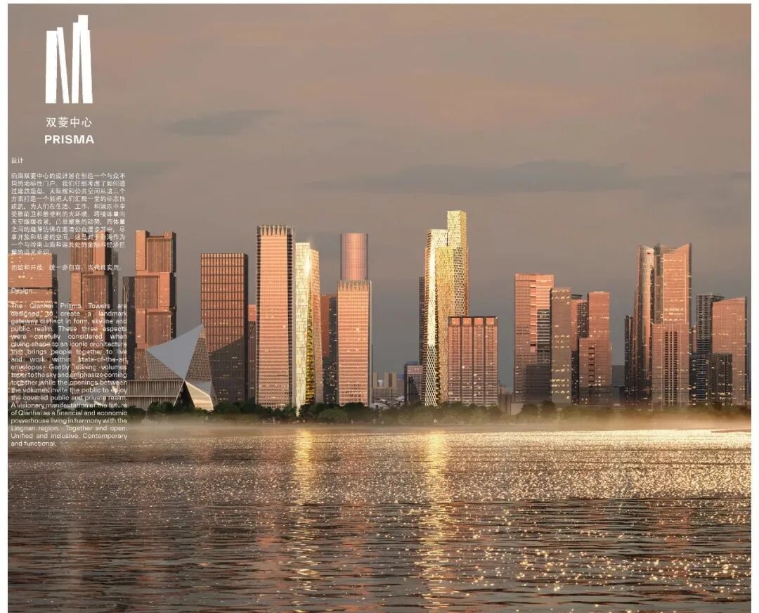 PRISMA双菱中心包含一座300米高公寓楼和一座250米高办公楼,两座塔楼位于深铁前海国际枢纽中心项目最后两块待开发宝地,分立于深港广场西端南北两侧,顺而成为通往桂湾区和前海湾的中央门户。这个设计旨在创造一个与众不同的地标性门户,通过建筑造型、天际线和公共空间从这三个方面打造一个能把人们汇聚一堂的标志性建筑,为人们在生活、工作和娱乐中提供最前卫和最便利的环境。塔楼的体量向天空缓缓收紧,凸显聚集的动势,而体量之间的开口仿佛在邀请公众漫步其中,尽享开放和私密的空间。这是对于前海作为一个与岭南山海和谐共处的金融和经济巨擘的体现。