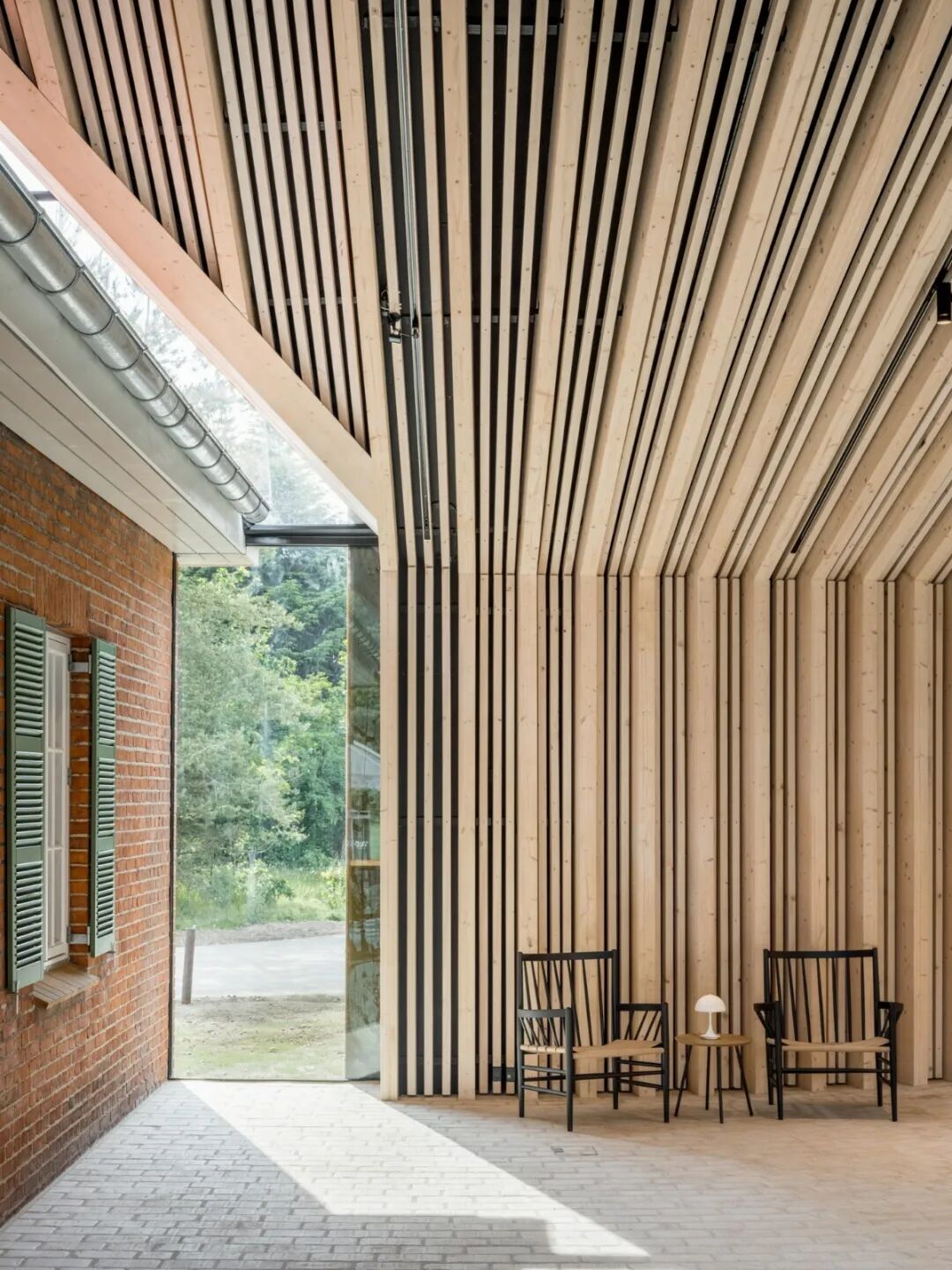 进入后,一堵从地板到天花板的弧形玻璃墙展现了一个有遮蔽的绿色庭院和森林的景色,那里曾经是难民营。