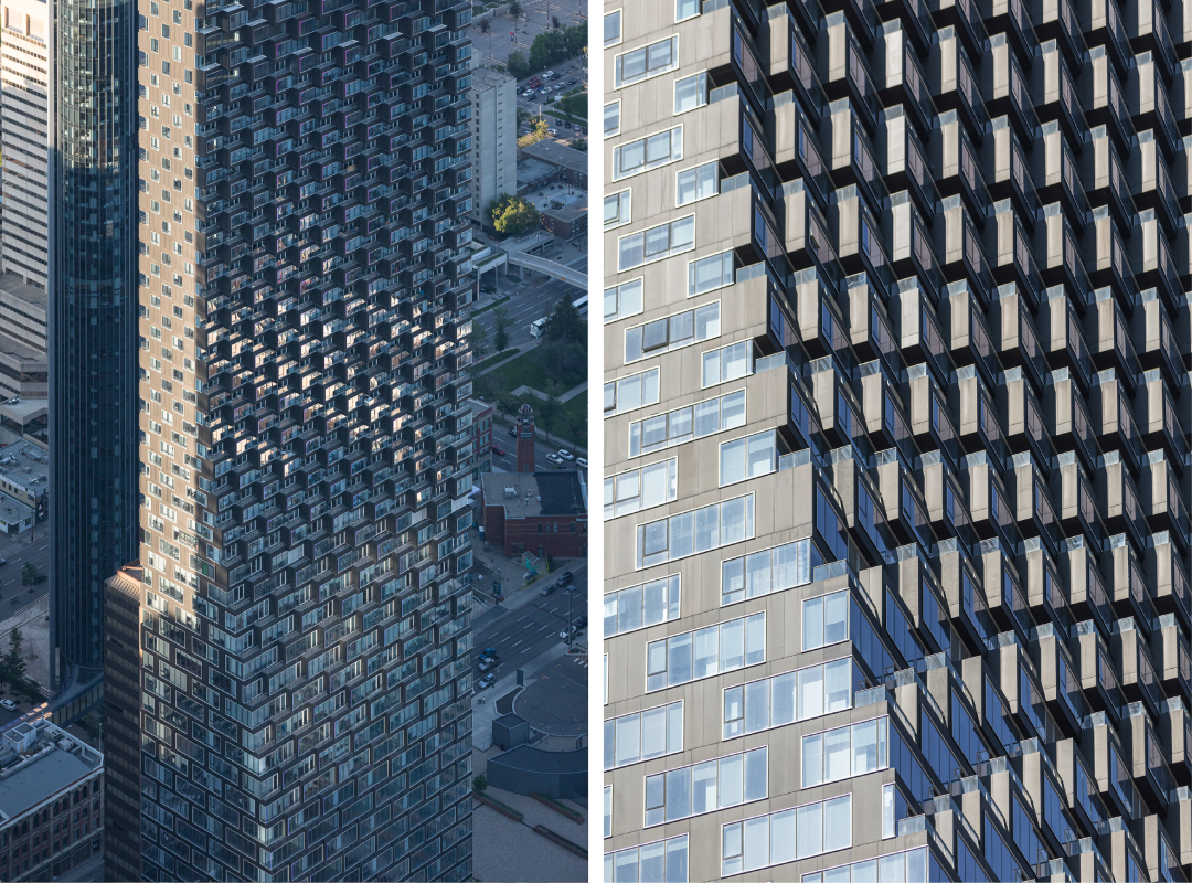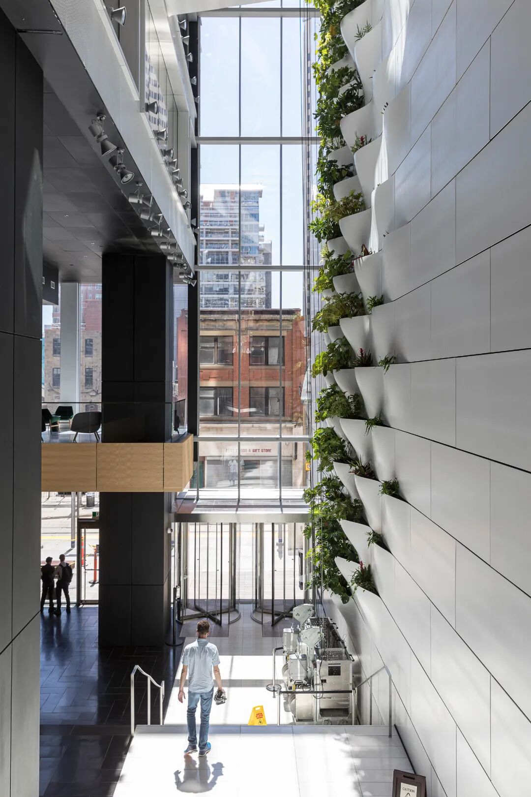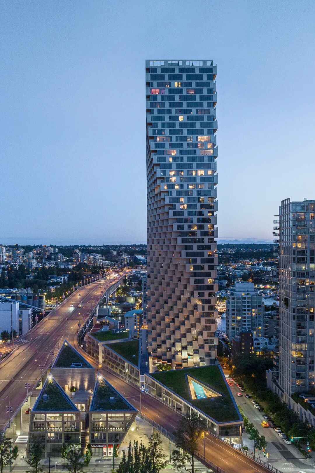 在主入口上方,立面的像素结构延伸到地块的轮廓之外,在拐角处形成一系列檐篷、露台和休息空间。 夜晚,加拿大艺术家Douglas Coupland 创作的 15,000 平方米艺术装置“北极光”照亮了塔的南北立面,建筑本身成为全市最大的公共艺术品。