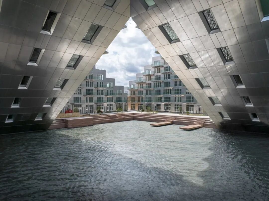 该建筑具有独特的形状,广场两侧的街区悬挑在水面上形成一个切口,另外两个街区向下形成露台,公寓在顶部阳台上开放。