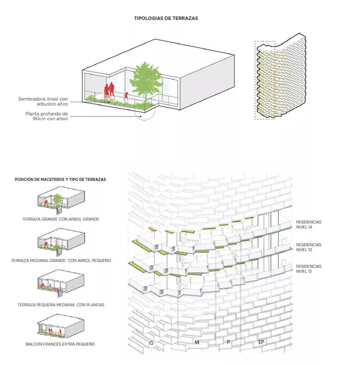 “我们将拉卡罗利纳公园引入建筑,在露台种植当地的树和植被:离公园越近,树就越高,”设计团队解释道。“每个阳台下的空心墙有足够的空间容纳每颗树的根系。种植的树池成为公寓内的一个混凝土雕塑,同时是上层公寓的树根区。”