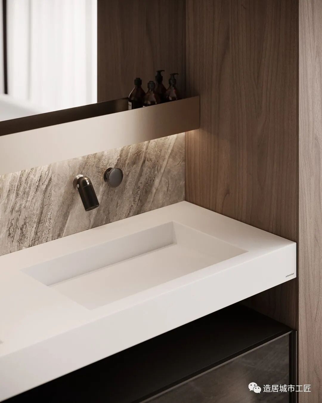 连接壁柜的洗手台则可以方便进出时洗手清洁的动作,第一时间将细菌和灰尘隔离在外,保持室内干净卫生。
