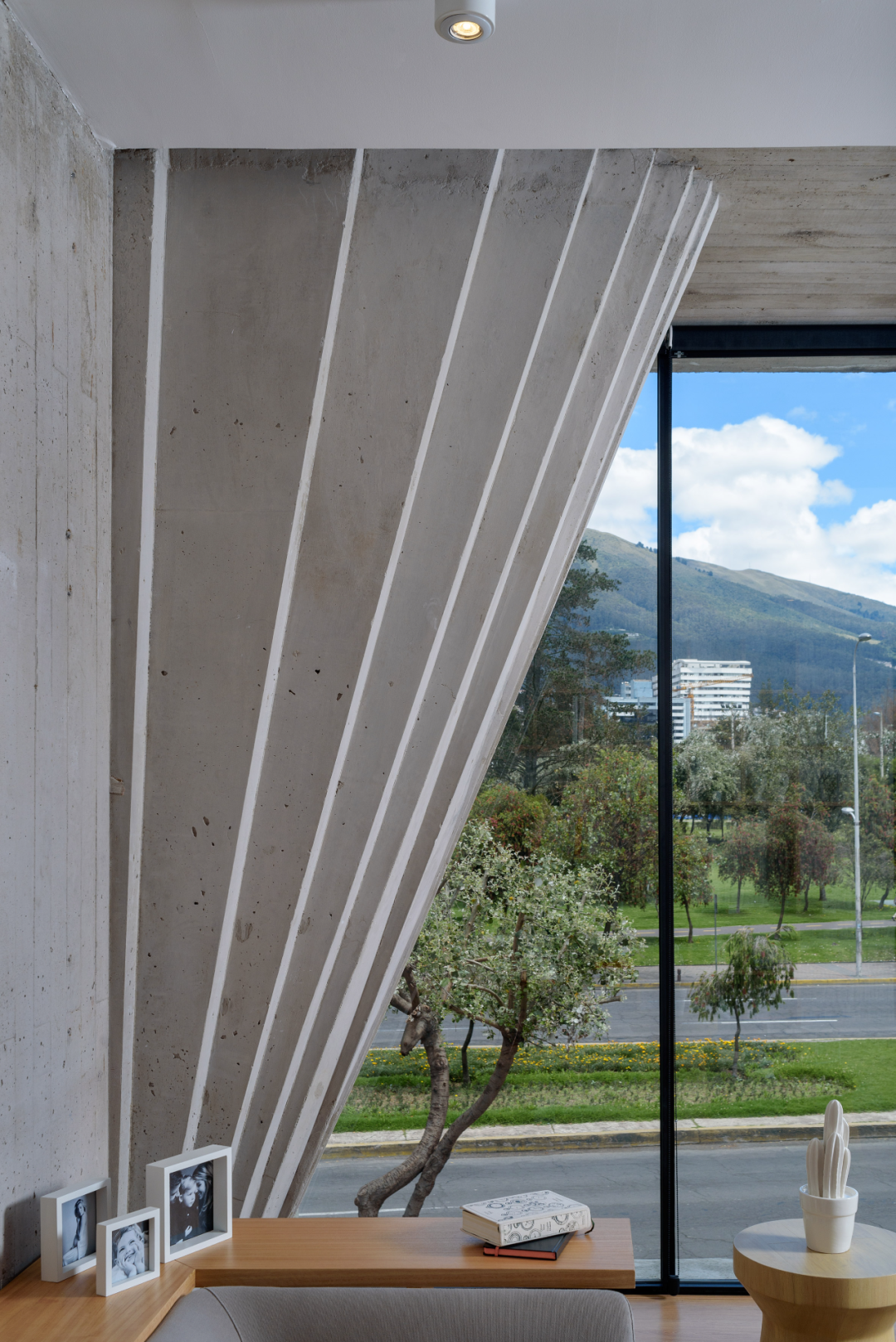 在公寓内,人们可以透过大面积的落地窗看到阳台上的树和绿植,也能眺望远处的城市景观。