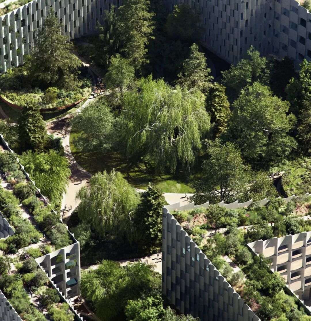 墙壁在围绕中央公园折叠时会突出,随着高度变化,形成独特的屋顶景观。在最高处,该建筑将有七层。