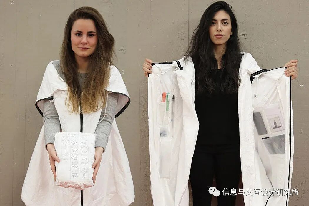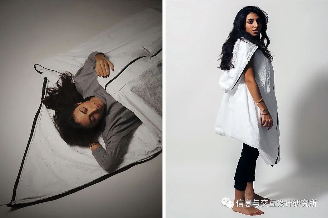 设计师设计出了一件轻量级的外套,同时也可以在夜间当做帐篷或简易睡袋。这款“可穿戴式庇护所”采用了高密度聚乙烯合成纸(Tyvek),其轻量又不失强韧,防潮湿抗水渍,是一种常用于建筑工地保护工人的材料,特快专递的信封就用得它。它很难被撕破,允许水蒸气通过,但又可以隔绝液态水,以供难民们晚间睡觉时保暖。