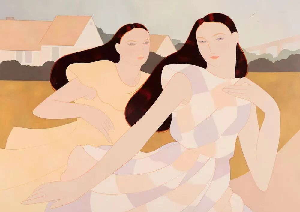 Kelly Beeman是Dior、Chloe、Loewe等奢侈品牌的御用插画师,擅长运用简洁线条和莫兰迪色调创造出富有装饰感的时装插画。她绘制的人物清一色是柳叶弯眉、狭长的眼型、扁平的面部轮廓,几乎没什么区别性。Beeman在采访里说到,服装是笔下人物获得灵魂的方式。