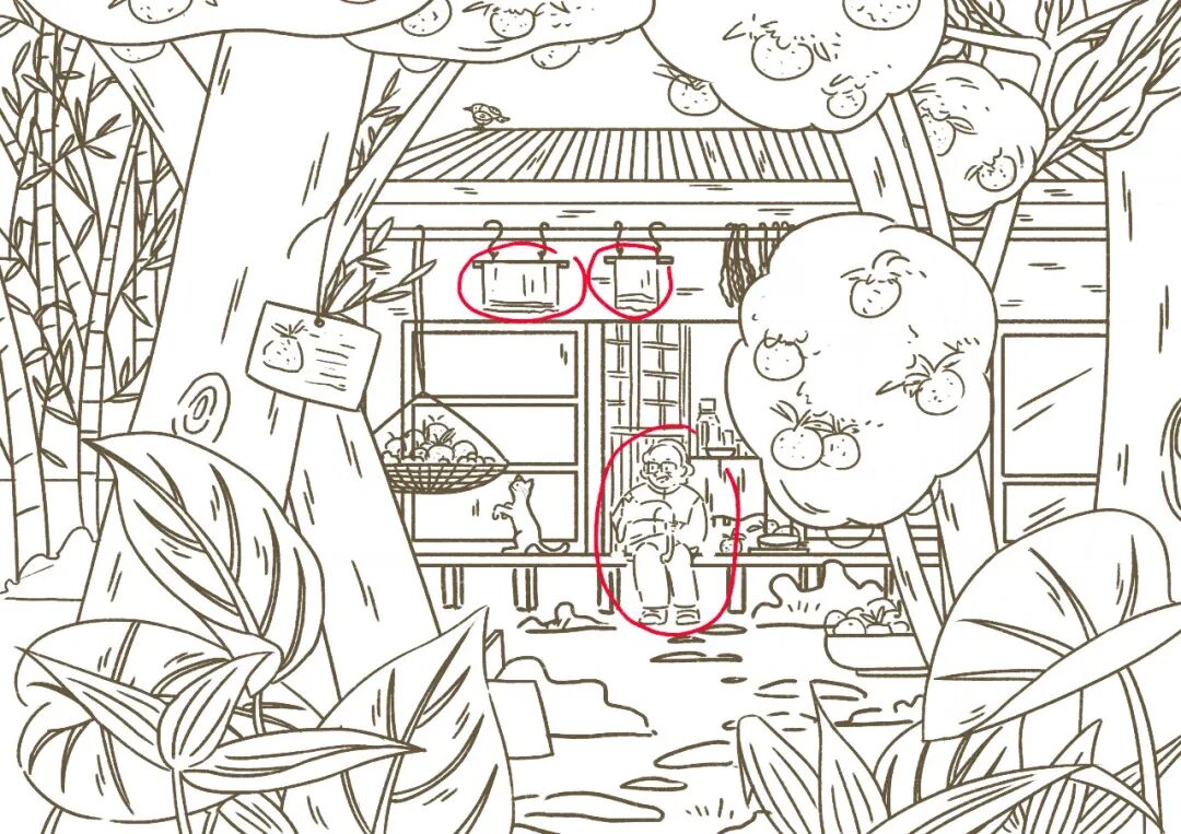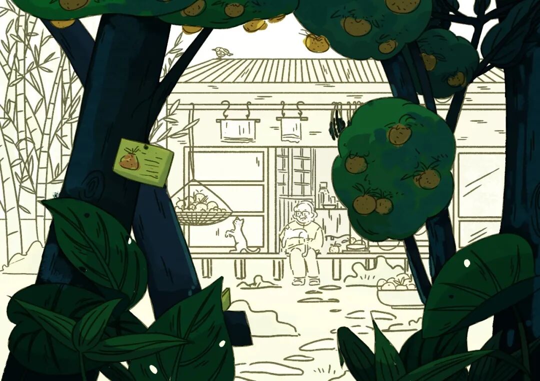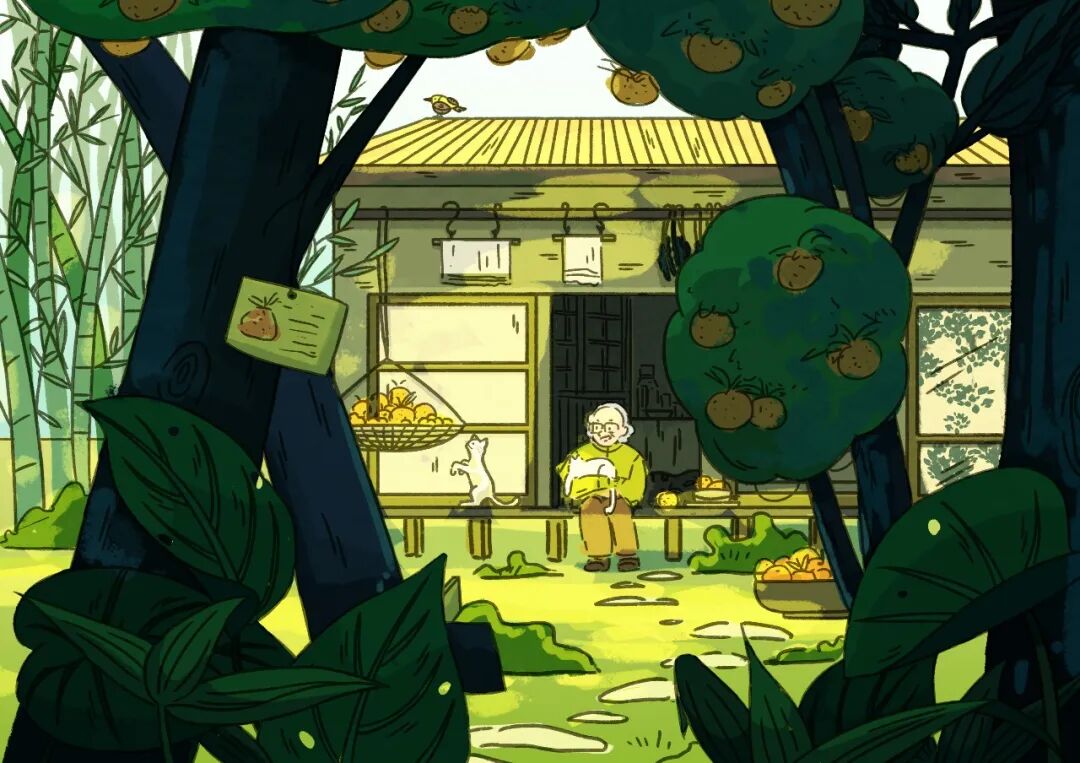 修改之后以橘子做为贯穿始终的主题线强化了画面故事性;增加了人物和猫咪之间的互动关联性;增加石子路,串联了果园和房屋的内在联系
