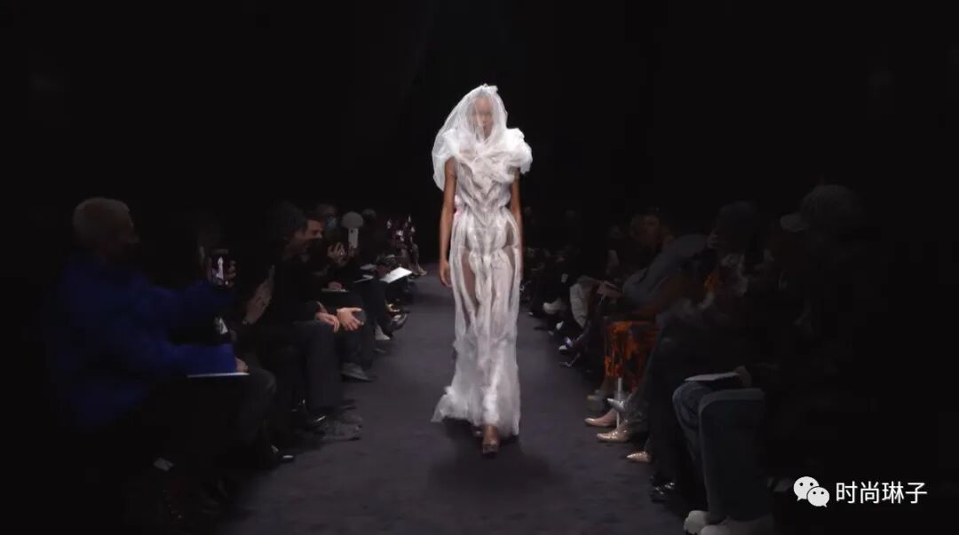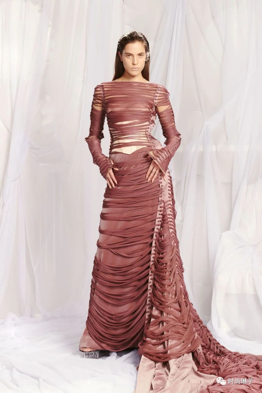 设计师Glenn Martens标志性的扭曲褶皱等面料再造工艺和让.保罗女性轮廓结合,打造出如雕塑一般华丽的高定礼服。