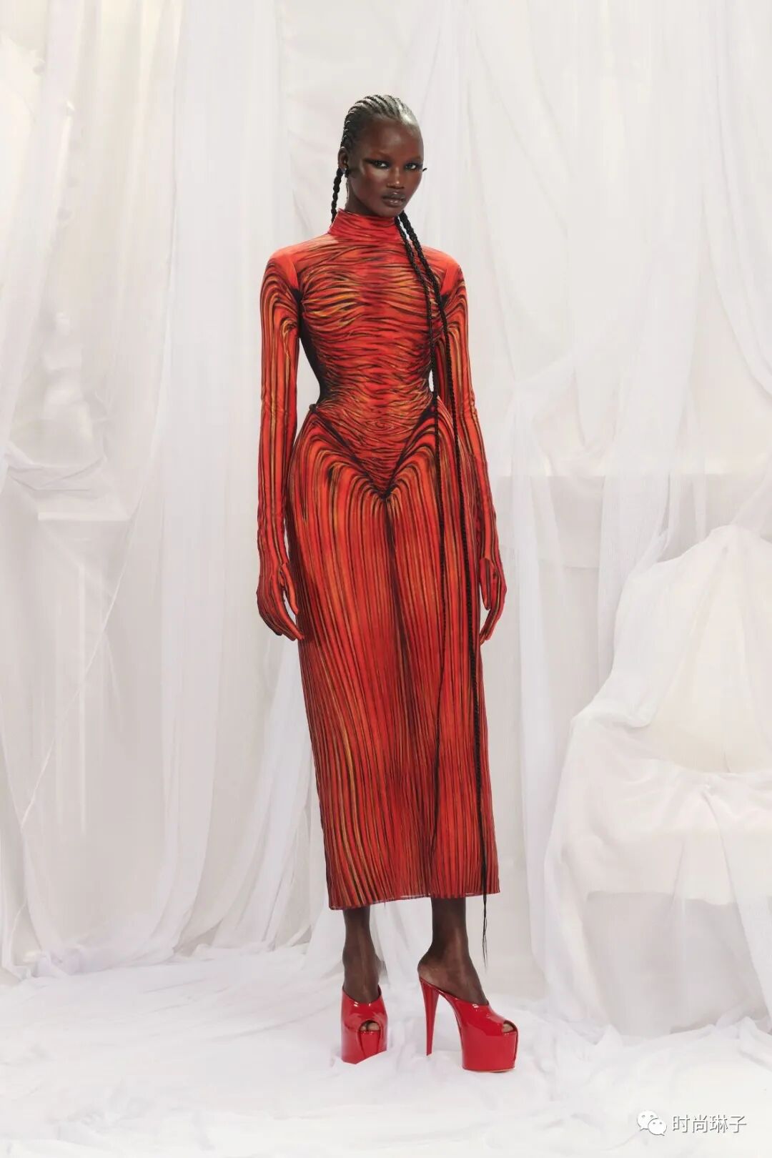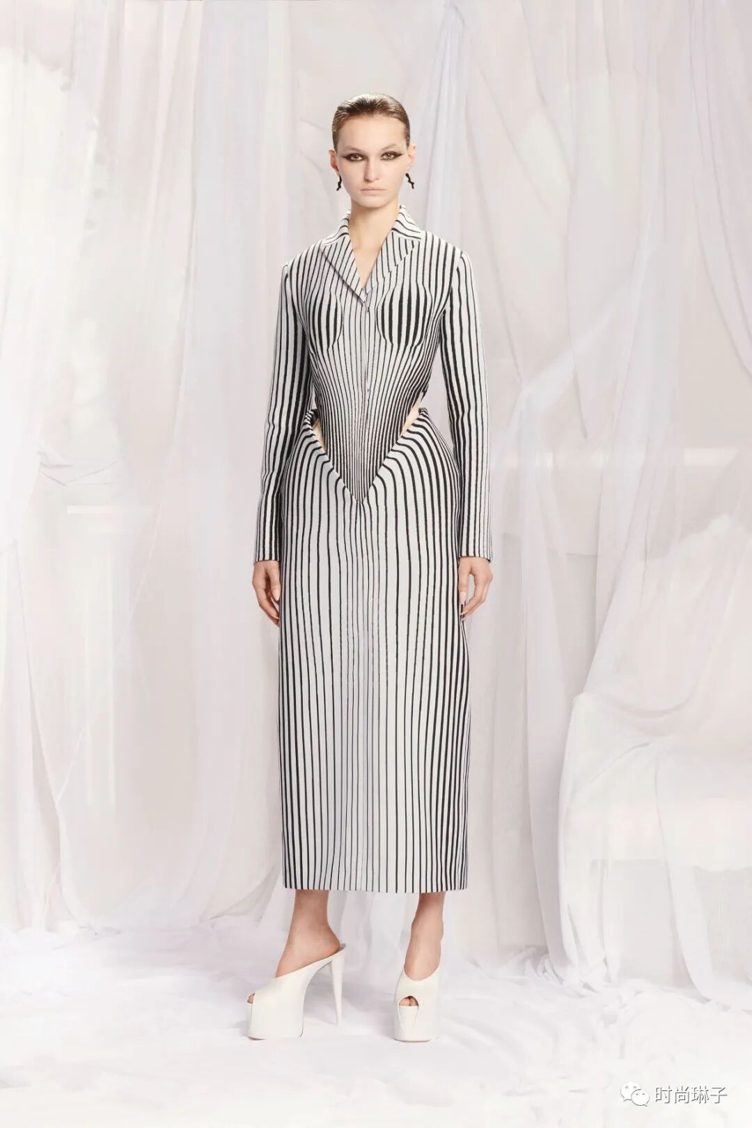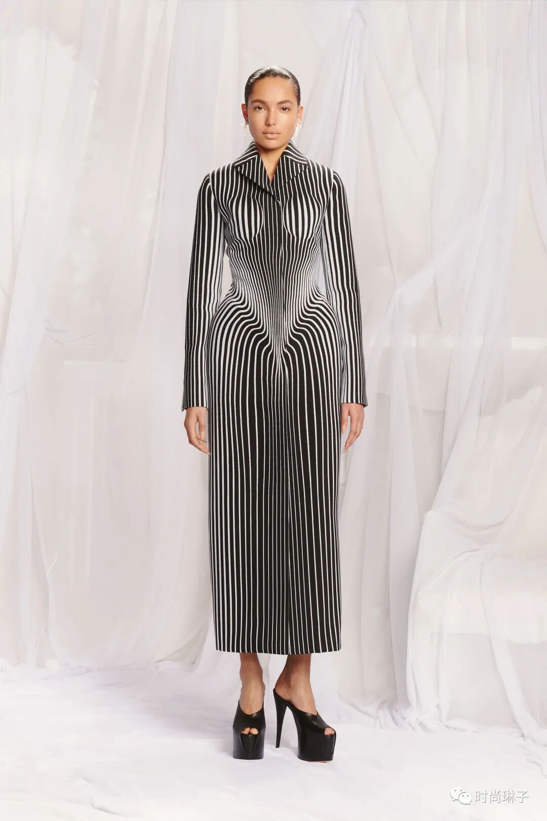 Jean Paul Gaultier让·保罗 标志性的海军条纹被打造成女性人体线条或3D 风格的波纹,设计师将自己的经典沙漏V廓形再设计,打造了V形的臀部造型,现代感十足。