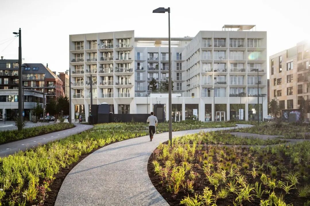 除了必要的道路铺装,将近三公顷的公共广场被设计为绿植空间。为了符合Eilandje的形象,在地下停车场上方布置了一个5000多平方米的多年生花园。ZNA和码头之间的花园空间将是患者、来访者和工作人员的理想休闲放松区域。