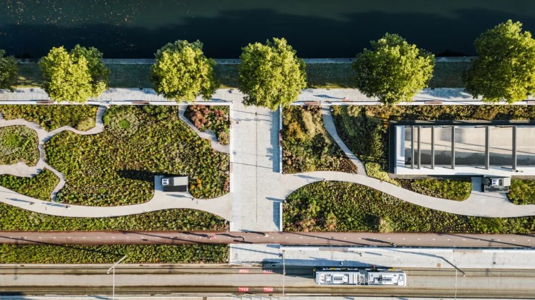 ▽码头边的雨水花园和树阵景观,Rainwater garden and tree array landscape beside the dock.