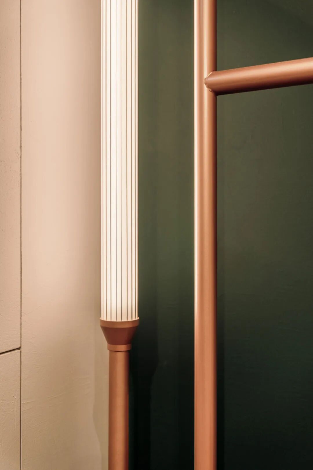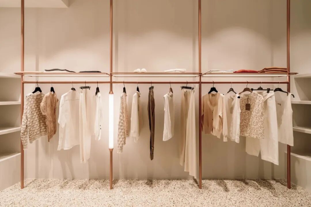 衣服精心地呈现在定制的灯光上,灯光展现在铜衣架中。自然光和定制光的结合,让你试穿的衣服完全属于自己。