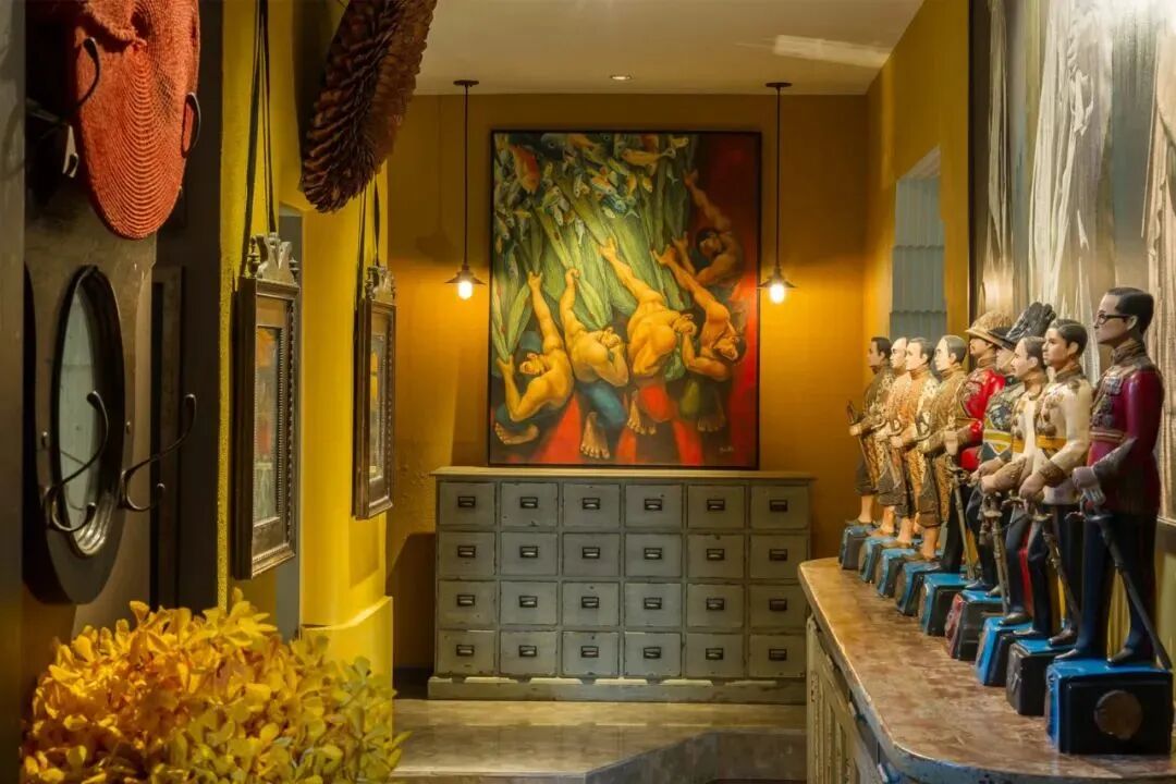 这个设计项目的魔力在于它的故事,该项目的DNA是巴黎高级时装与传统 Hill Tribe 服装之间的持续比较。设计所呈现结果是一座迷人的云端宫殿,点缀着50种芥末色!光是大堂,就堆满了堆到天上的古董皮箱、飞天帽、军装和山地部落项链等物品。所有这些物品包括1900年代巴黎的原始店面都是设计师在巴黎、林肯、曼谷和更多地方的跳蚤市场采购的。