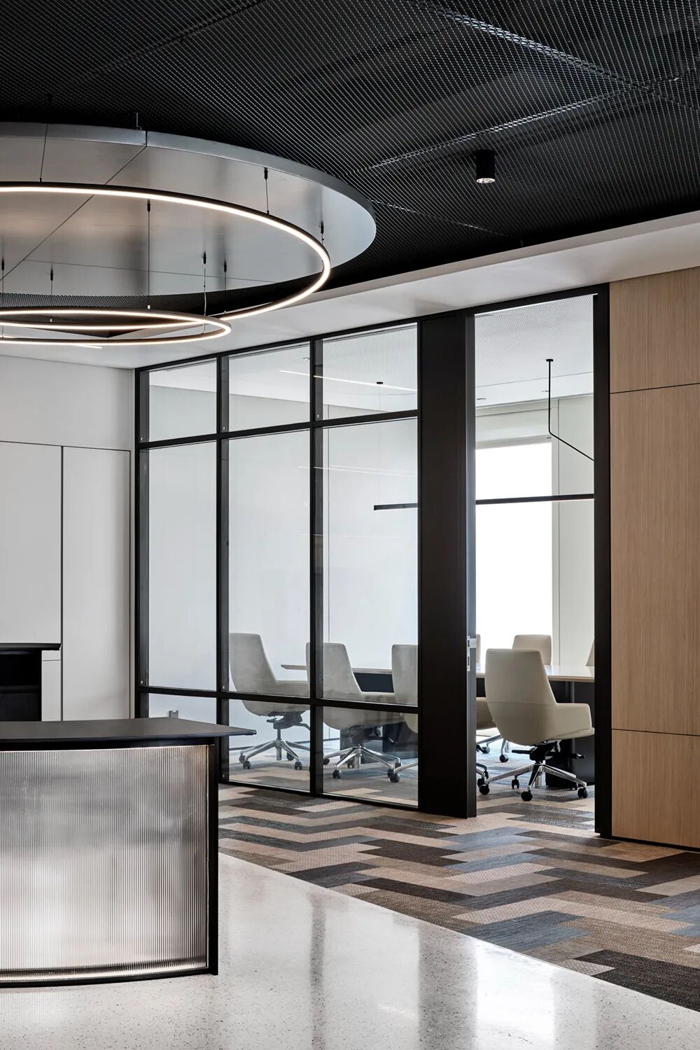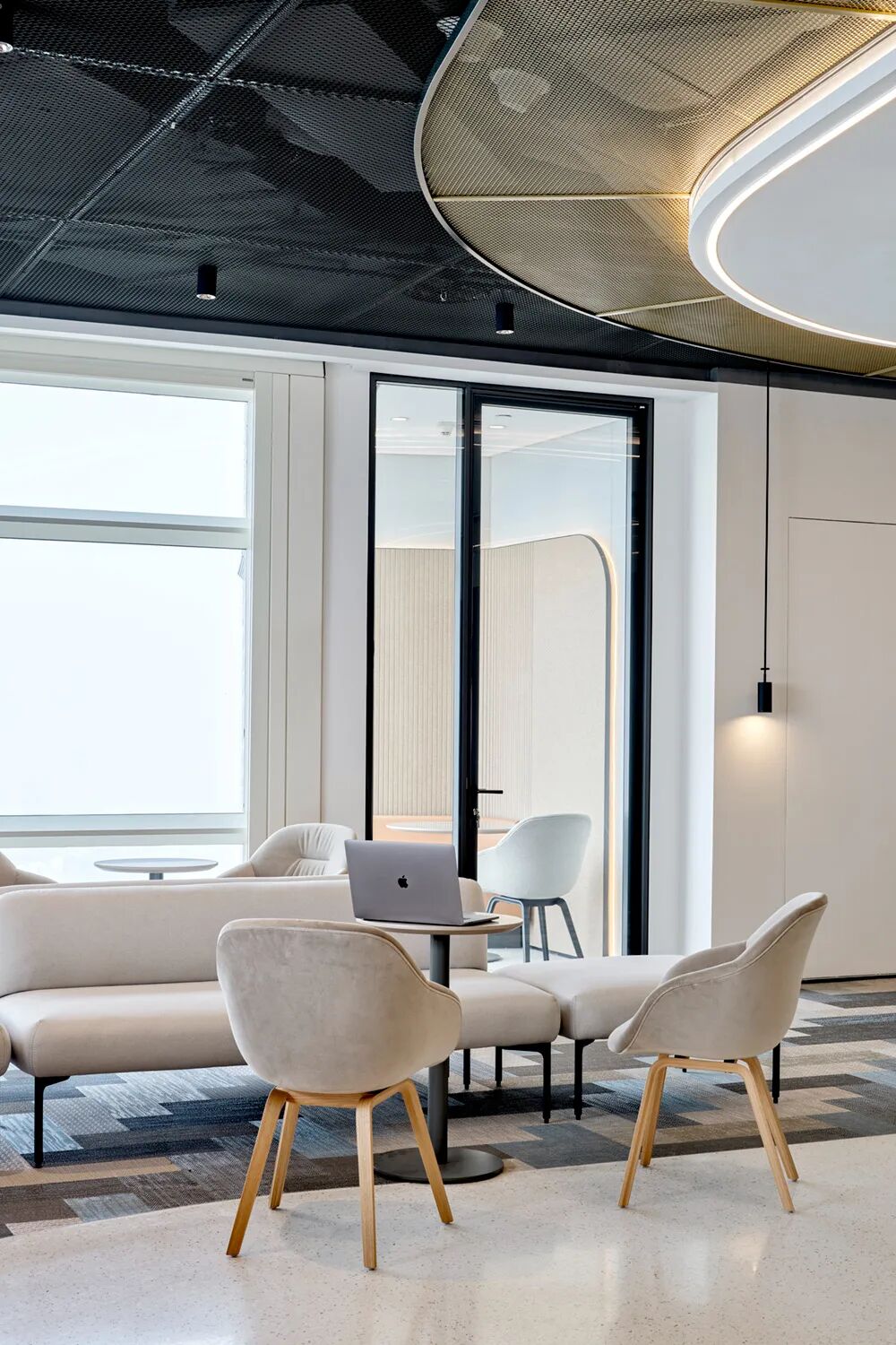 后场办公区延续了前厅ABW的办公理念,结合不同功能形式的会议室、电话间,提供了多选择的工作模式,简洁而高效。大量可再生面料的墙饰、可回收吸音板和仿生苔藓的应用,丰满了视觉层次并极大提升了空间的声学效果。