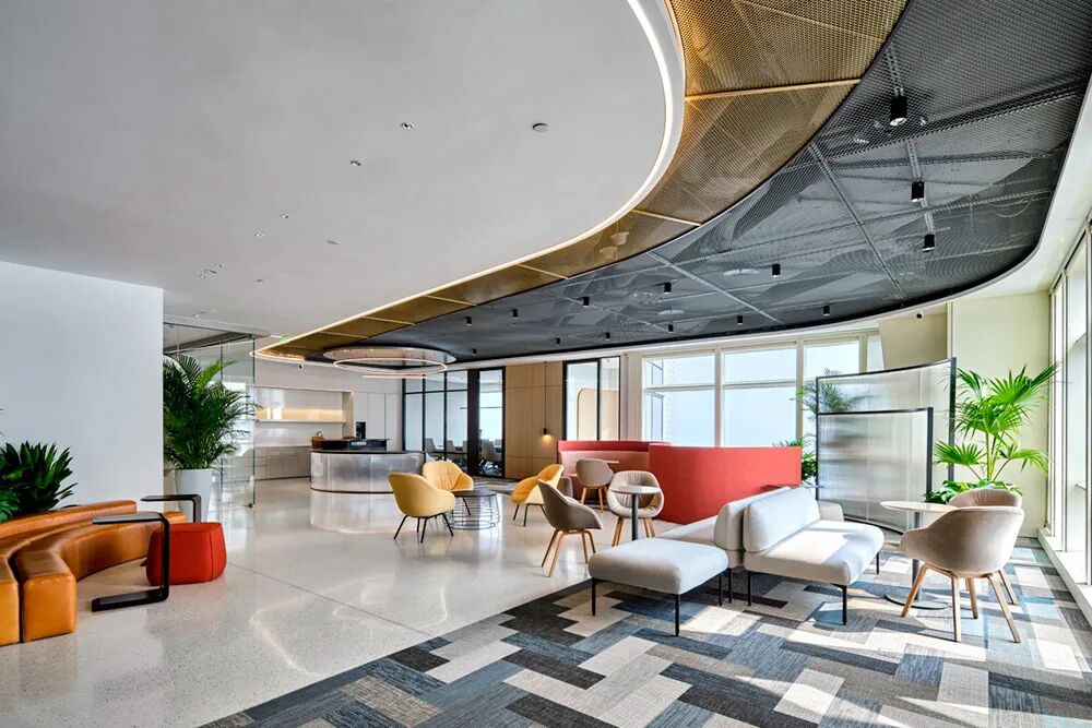 不同于投资公司的传统形象,正轩以一个圆岛吧台和开敞的自由交流区作为前厅接待场所。大量的自然光涌入室内,明净开阔。天花地面是圆转流动的曲线造型,采用水磨石地面、金属网天花、Bolon塑胶地毯等各种新环保材料,辅以色彩鲜丽的多功能家具组合、大型LED屏和随处点缀的绿植,呈现出年轻、现代、科技而又充满能量的生命气息。