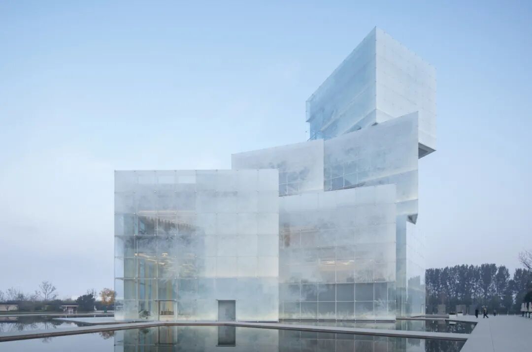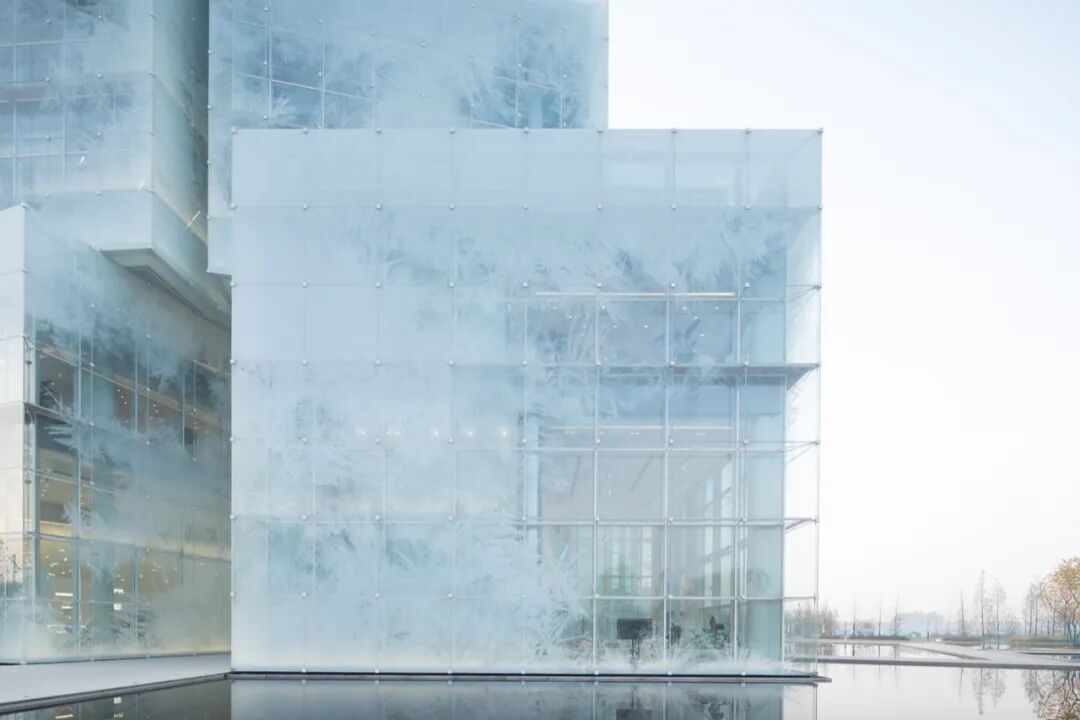 这个被称为“冰立方”的项目宛如一座巨大冰雕漂浮于湖面之上。10个“冰块”层层叠置,扭转交错,形成复杂动态的体量。立面构思源于冰花,随着视线的移动,看似简单的外表会发生微妙而复杂的变化。