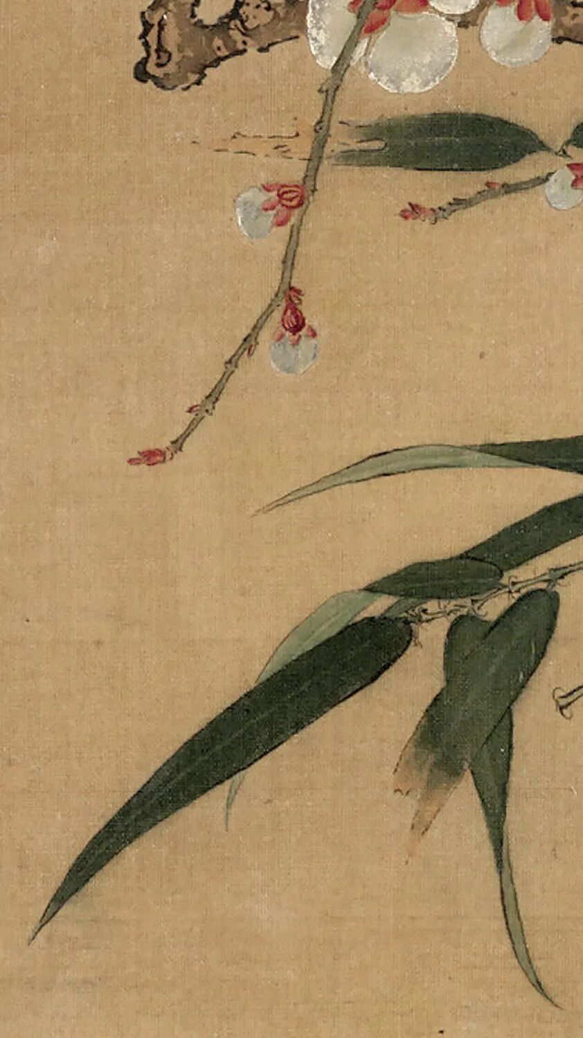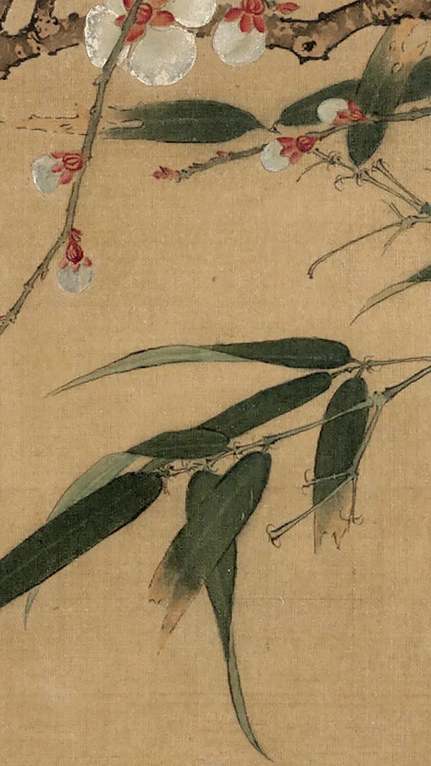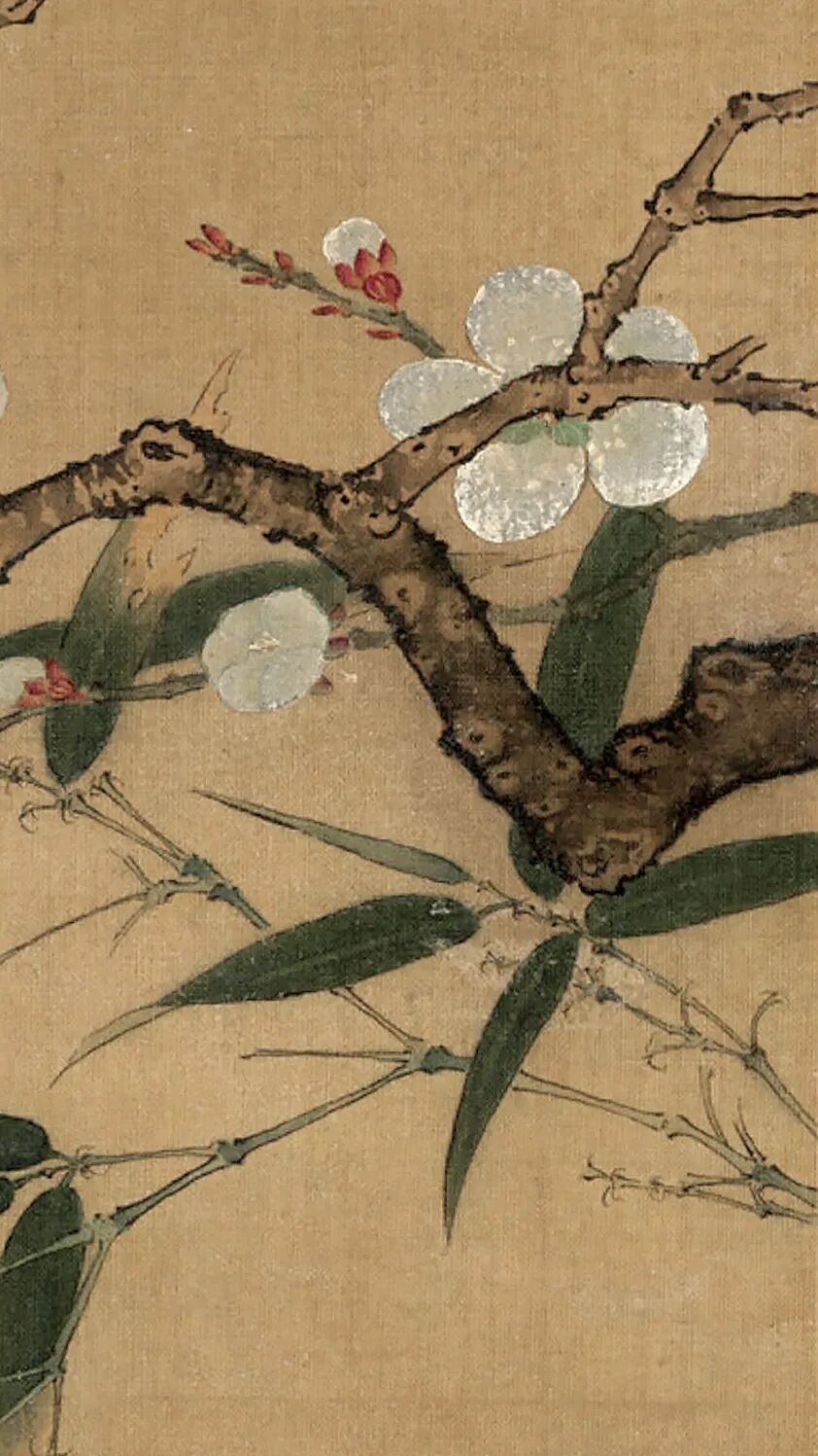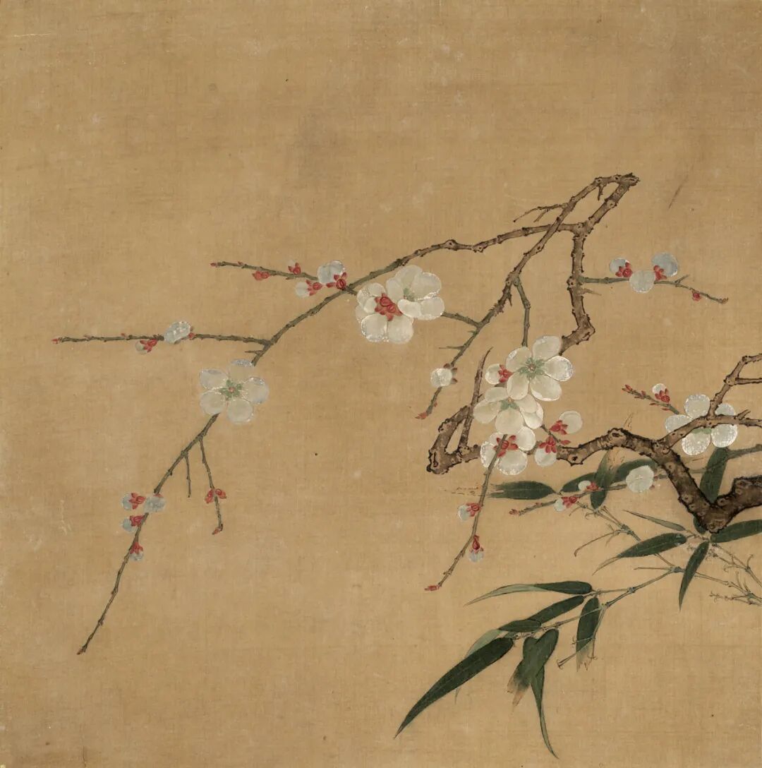 《梅竹图》是一幅意境幽远的佳作。图为已故名画家、书画鉴藏家唐云所藏,画寒梅数枝,横斜劲挺,其间绿竹穿差,偃仰扶疏,顾盼生情。造型精准,设色明丽,笔法秀朗,虽然画面简单,但因为在疏密、错落、主宾诸方面经过十分经意的安排,故在在恰到好处,着墨不多而生机满幅。作者不仅有敏锐的观察把握自然美的能力,更有诗人般的取舍剪裁能力;他有精准的造型手段,不仅能恰到好处摹写对象的形质,更能生动地凸现其风姿神采。