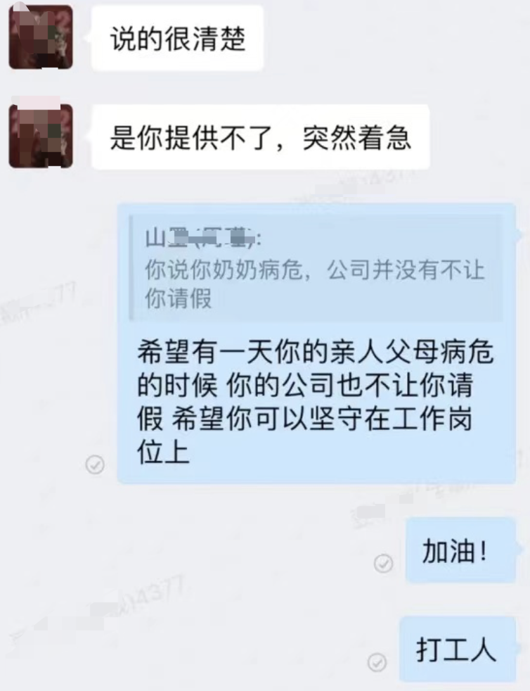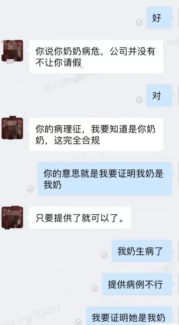 最新文章2024-01-22 病危请假,被hr要求证明是亲奶奶。令人极其无语 来源:瞎设计什么 图片来源:ZHANG 啊啊啊啊 真是见鬼了 以前看过新闻,银行要求证明逝者身份 要求逝者本人来办理 这种大无语的事情 没想到居然在职场中也出现了 杭州一公司的员工 接到电话被告知奶奶病危,于是向公司请假 结果公司的hr居然要求证明 病危的是自己奶奶 关键是什么呢 自己提供了诊断证明 依旧被hr要求提供户口本,身份证等 ...... 张女士的聊天记录 来源小红书 ID:ZHANG 从这聊天记录看下来 真的是一点人情味都没有啊 谁没事拿这种理由请假呢 请的又不是病假 还要证明、证明个锤子啊 真是的...请假不是很正常嘛 明天心情不好,请个假不也正常 何况出现这种事情呢 以下是张女士在企业微信上的聊天记录 来源小红书 ID:ZHANG 没人情味就算了 后续这公司直接把人提出群了 企业微信踢了、公司群也踢了 连离职手续都没办 这家公司叫 app产品是 真是的 打工人都不体谅打工人 有记者 额.... 3连走一波,明天见! 本文来自微信公众号“LOGO好好玩”(ID:Playdesigns)。大作社经授权转载,该文观点仅代表作者本人,大作社平台仅提供信息存储空间服务。 TAGS: Zhang公司要求证明请假 相关文章英赫日报 | 李宁 × 空…米兰时装周的异星来客,用结…米兰“MoLo”移动与物流…西班牙艺术家 Juan d…把小鸟画成美少女,她弃医从…这些鸡蛋包装不只是有趣,设…国产文具又炸了!晨光再造“…七点资讯 |《更衣人偶坠入…AlphaDraw筑绘通「…秦始皇的黑,是你不懂的黑。