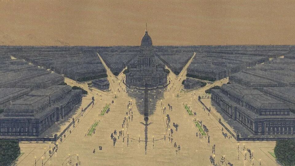 1909年芝加哥计划,也叫做“伯纳姆计划”,是一个富有远见的进步时代提案,旨在美化芝加哥并提高其商业效率。计划在芝加哥商业俱乐部的支持下发布,使用效果图传达了一个快速发展的城市场景。尽管想法从未成为现实,但作为一份文件,至今仍是城市设计的参考模板。