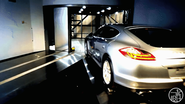 该汽车电梯的设计与 2016 年完成的保时捷设计大厦内的电梯相同,住户只需将车停在指定位置,电梯内就会划出自动停车机器,机械臂会将汽车固定、铲起并移动到电梯内。