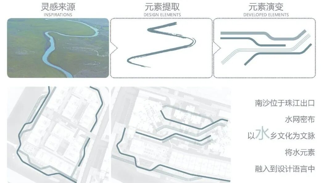 西侧展示区处于河流交汇的边界地,呼应水网密布的珠江文脉,抽象的线条由外部骑行道向内部园区衍生,强化序列感与仪式感,同时牵引起空间的流动感。