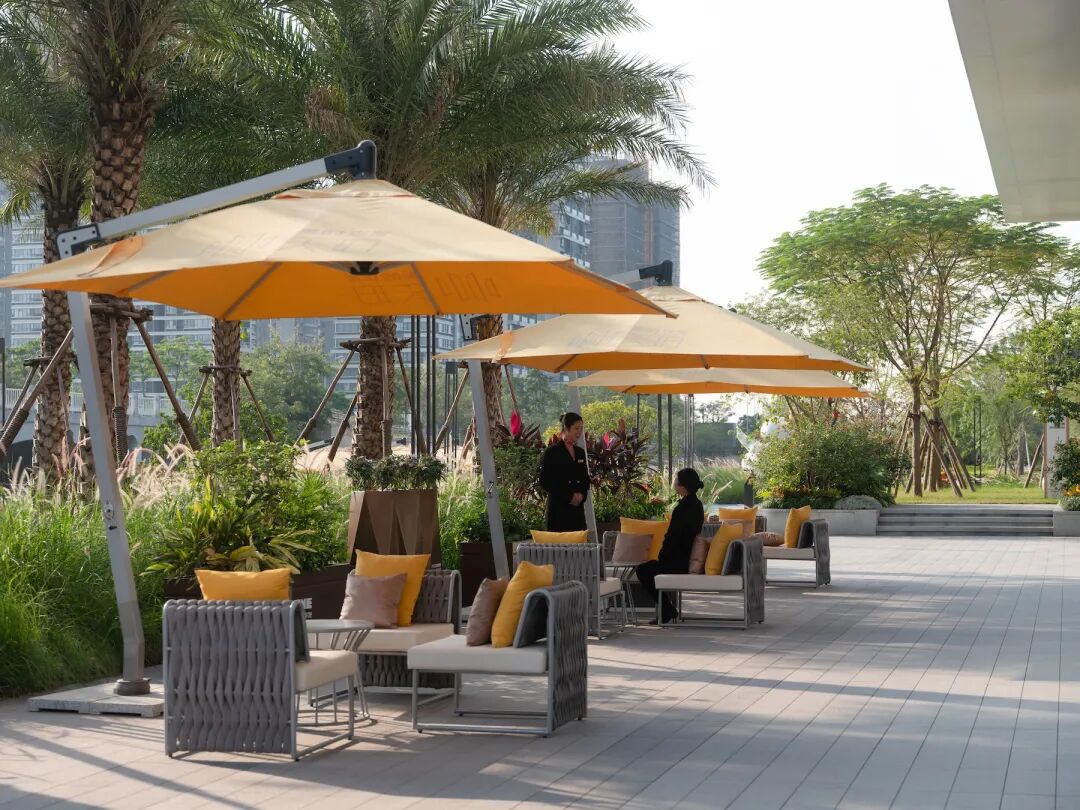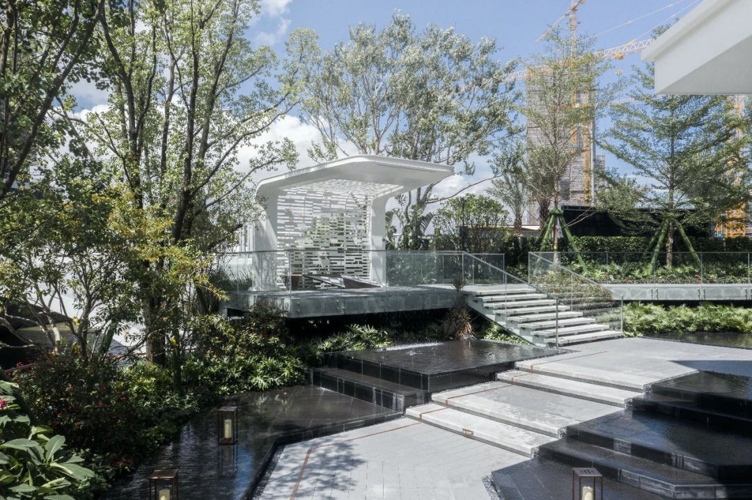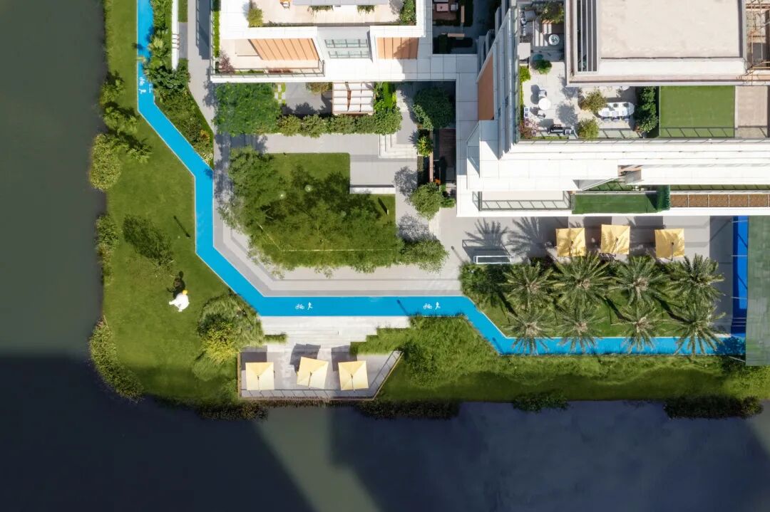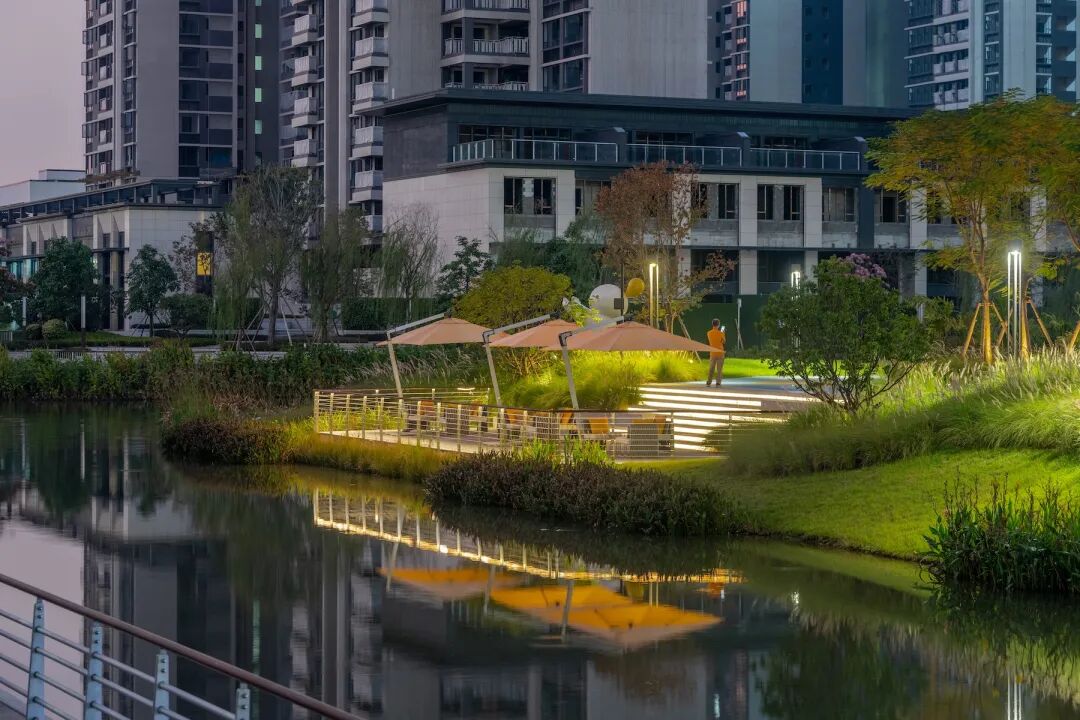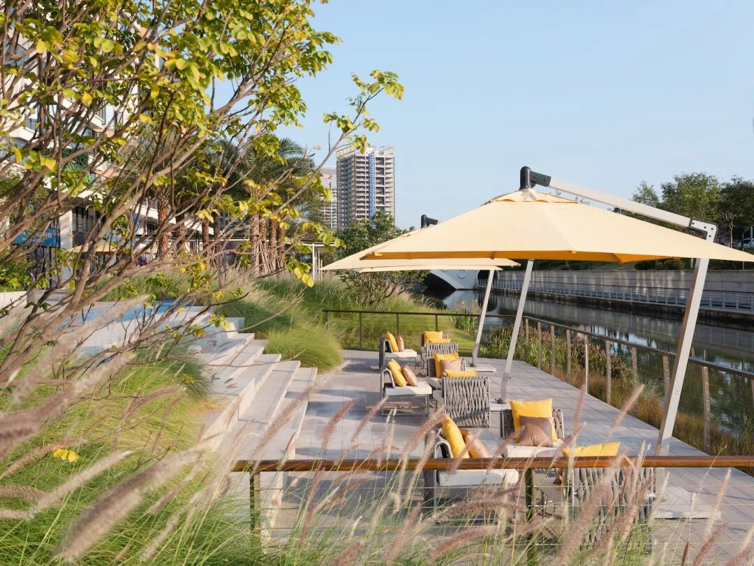植物与水的自然围挡让此处成为调节小气候的空间,跟随流水台阶的转折与引导,感受进入私密庭院般的静谧与舒适,构建滨水生活的第一印象。