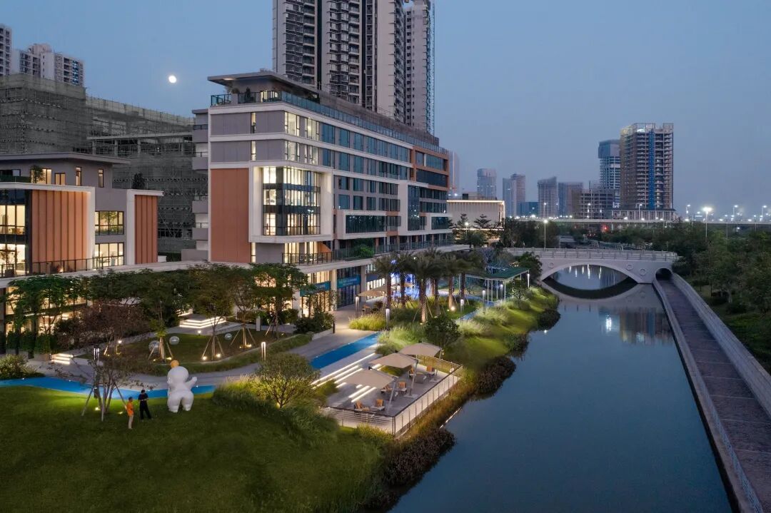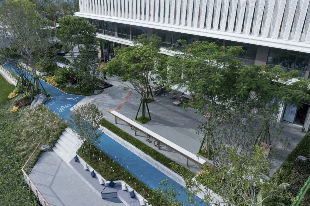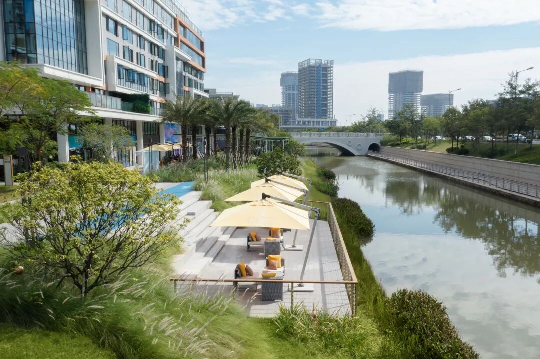 不同形态的休闲商业外摆,活力骑行道与滨水观景平台,以靠近河岸的逐级下沉,构成了临水而居的多种生活方式。通过植物层次划分空间,塑造通透视野,引入河岸的自然闲适。