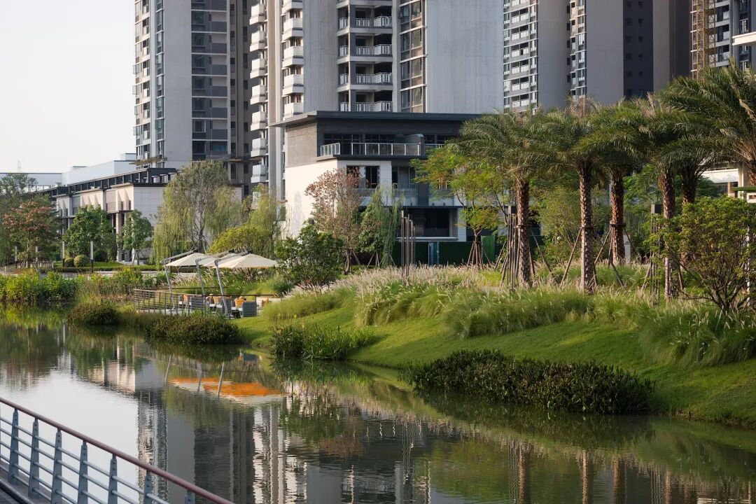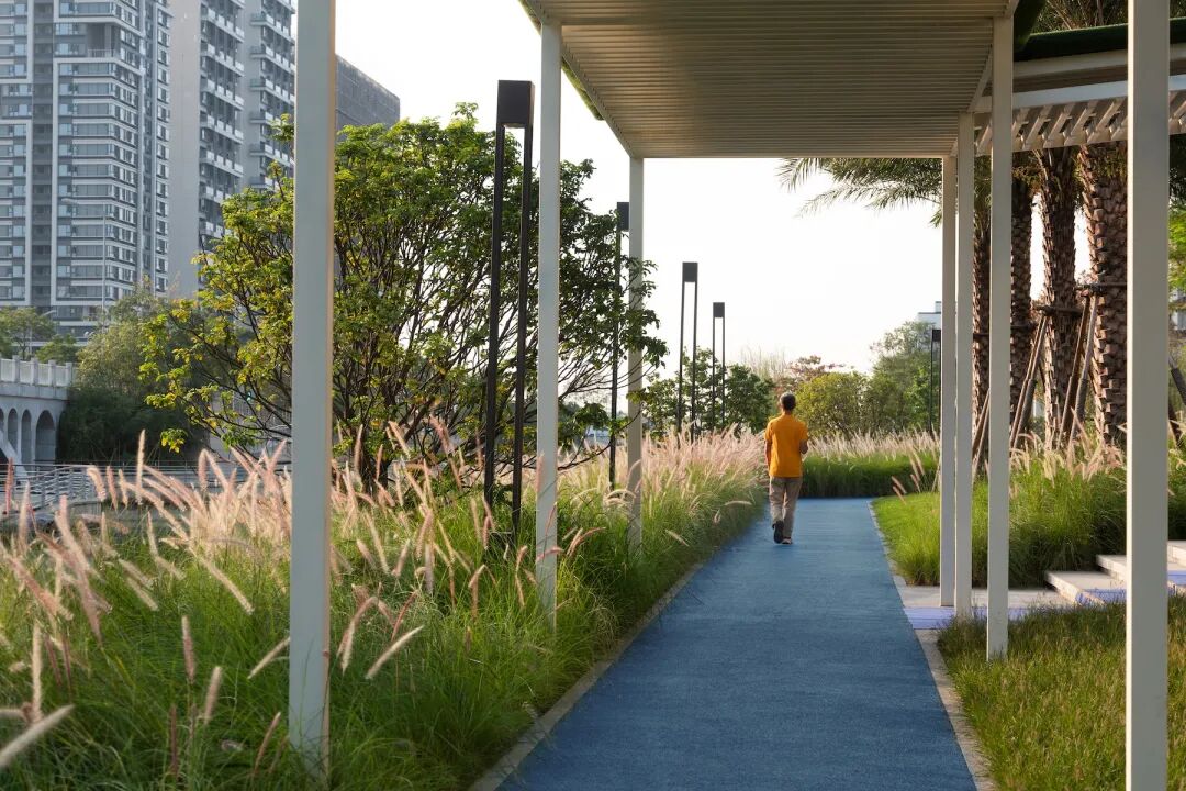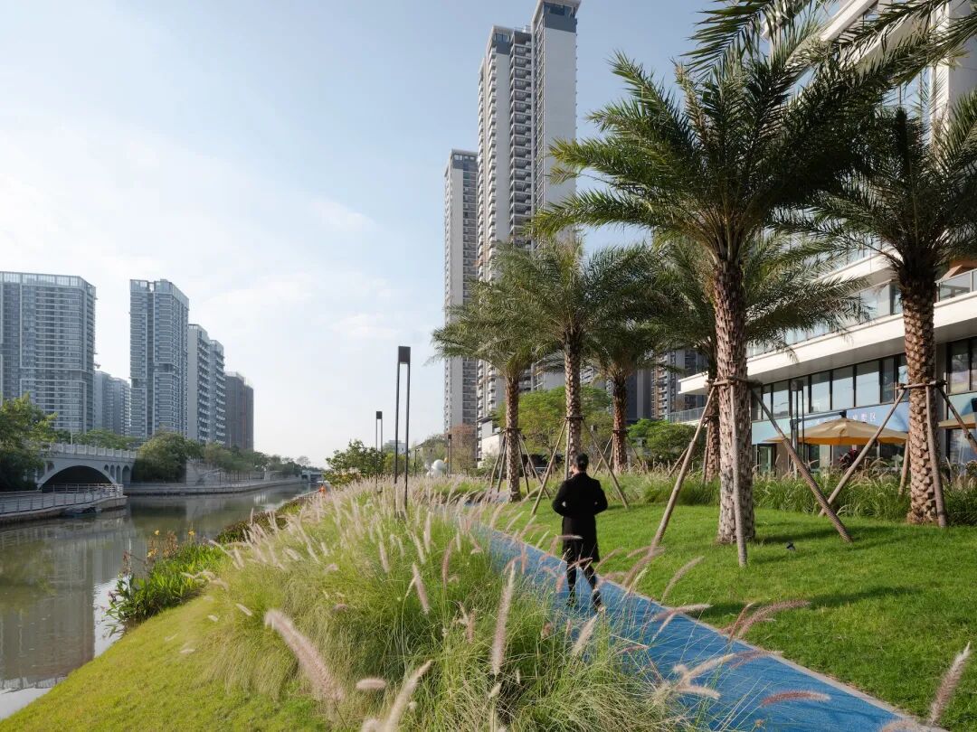 沿河岸的自然缓坡结合以大乔与观赏草为主的疏朗植物层次,让滨水景观一览无余。一道河流作为缓冲地带,让城市与生活以微妙的距离,增添自在呼吸的空间。