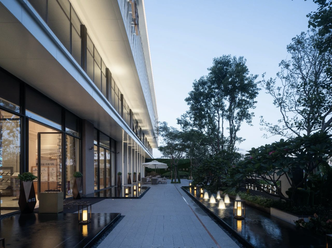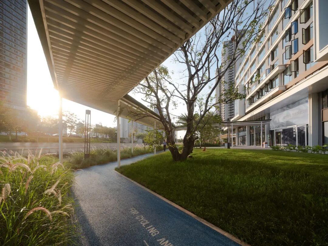 一条风雨连廊将人庇护至室内,沿其行走,将通过市政道下的隧道抵达东侧地块。轻巧的曲径伴随摇曳的光影,赋予人居环境的品质与度假自然般的气韵。