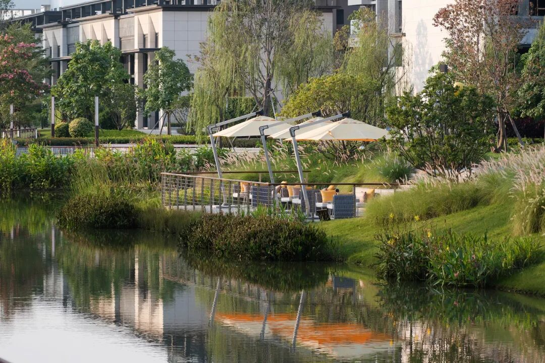 浪漫的观赏草围合出一处自然领地,屏蔽着来自世俗的繁杂,缓慢诉说“偷得浮生半日闲”的可贵,身旁的河岸亦构成了生活能量的源泉,萦绕着宁静致远的基调。