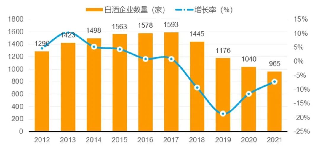 以白酒市场数据为例,根据国家统计局统计数据显示,2021年末,年产值2000万元以上的白酒企业为965家,较2020年末的1040家减少了75家;白酒市场增速自2018年开始转入负增长持续至今仍然没有转正迹象。