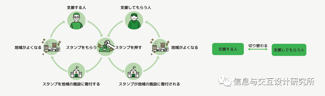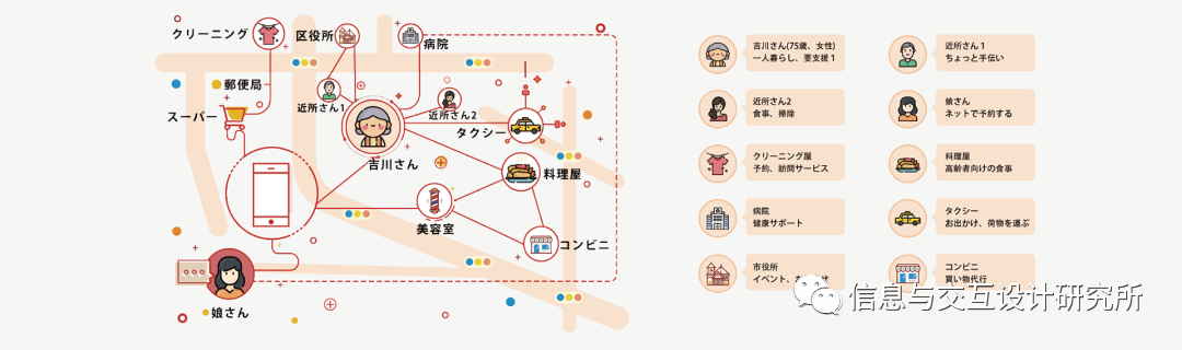 在该研究中,设计者研究了为老年人提供各种帮助的生活服务系统。目的是通过综合服务提供给用户一个可以安心生活的社区,使他们能够更加密切地与当地其他人联系,并为在日常生活中需要帮助的老年人提供公共服务。