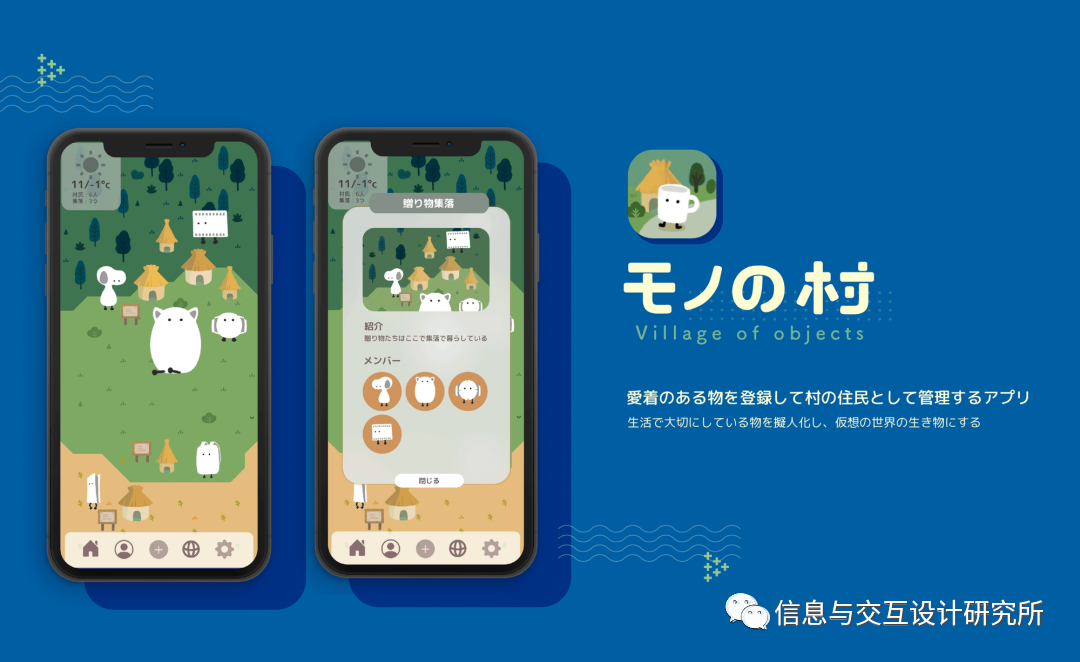 “物之村”是一个概念性的服务设计,在应用程序中记录下真实事物的信息,并以数字表达方式留下对事物的记忆和体验。在记录下事物真实的信息后,物品此刻的状态就会一直留存在“物之村”中,带给人们一种安全感。即使随着时间的流逝,物品的功能性不如从前了,但因为物品初始的信息被记录在“物之村”中,人们会有一种它还是和以前一样的感觉,所以会用很久,这种感觉就是对事物的执着。人们的记忆和他们自己的生活经历被投射到他们所依附的事物上。人们认为,通过观看事物,您可以回忆起您容易忘记的记忆和过去的美好经历。