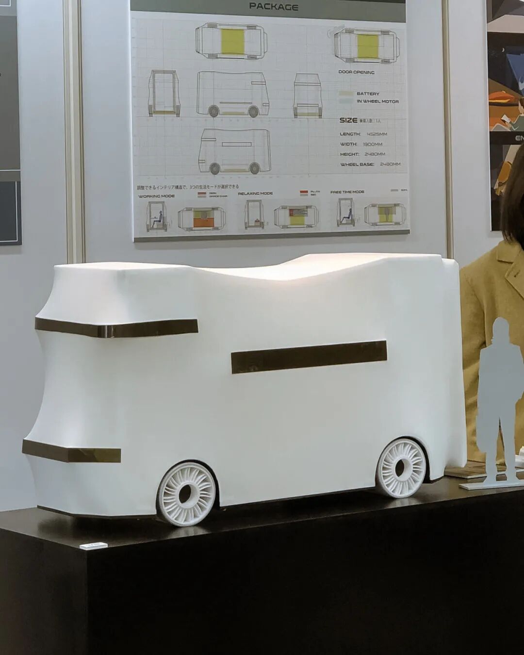 背景设定在2040年,随着科技、移动即时服务的高度发展,环境可持续发展的需要,移动办公的普及,人们的生活方式进入了“3A”时代(anytime,anywhere,anything)“家”不再被束缚在固定的土地上。这种新生活方式和趋向安定,寻找归属的人类本性形成反差,不免的让人感到孤独。以“巢”为灵感打造的休闲娱乐工作等多功能一体的共享移动生活空间,让人们感受家的温暖。柔和的巢穴造型使其停泊在道路边也能成为一道赏心悦目的风景。