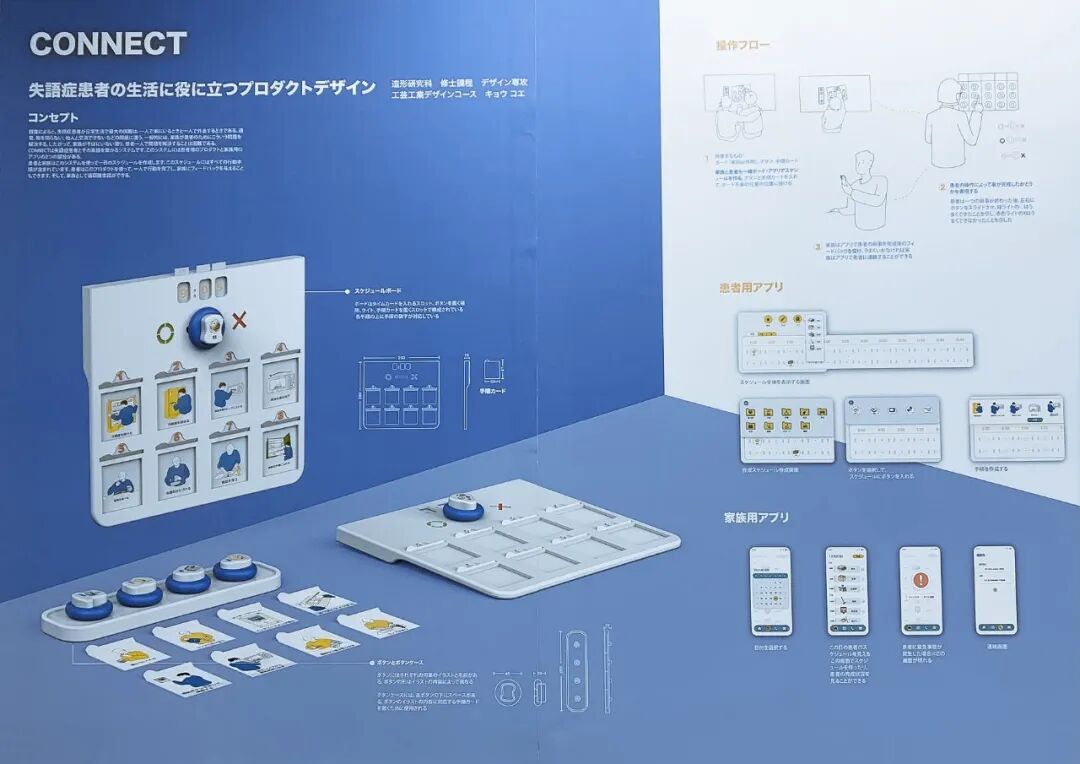 「CONNECT」是加强失语症患者与其家人联系的一套产品&服务系统,由患者端,家属端两部分组成。患者和家人在这套系统上共同制作“一日行动计划”,计划表以图示的形式提示每个行为的必要步骤,以指导患者行动。