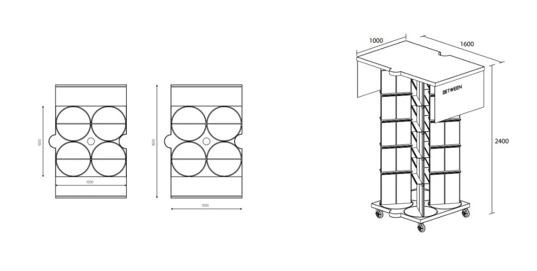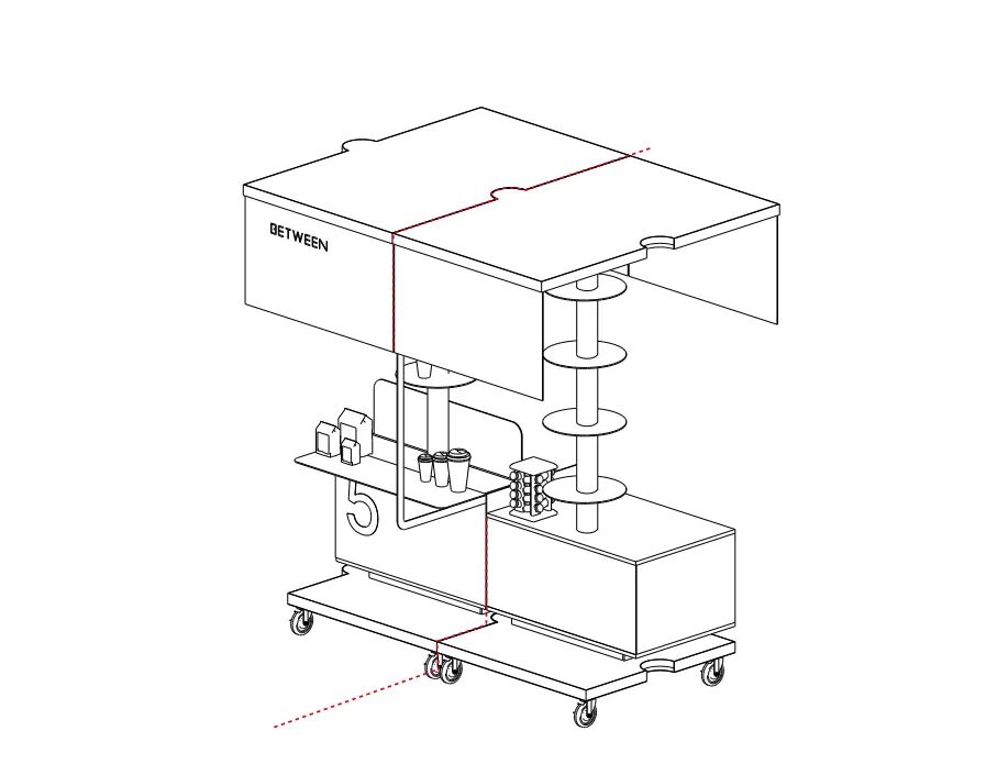 而空间之中,为了满足‘between’之间的灵活感与趣味性,我们为彼屯品牌专门设计定制了一套可移动的模块化推车系统。每个模块推车在平面上只占据1mX1m的空间。初期的三组模块我们定义为‘移动艺术书架’,‘咖啡制作小车’以及‘移动展示货架’三个功能。三个推车模块可以分拆,也可以合并。