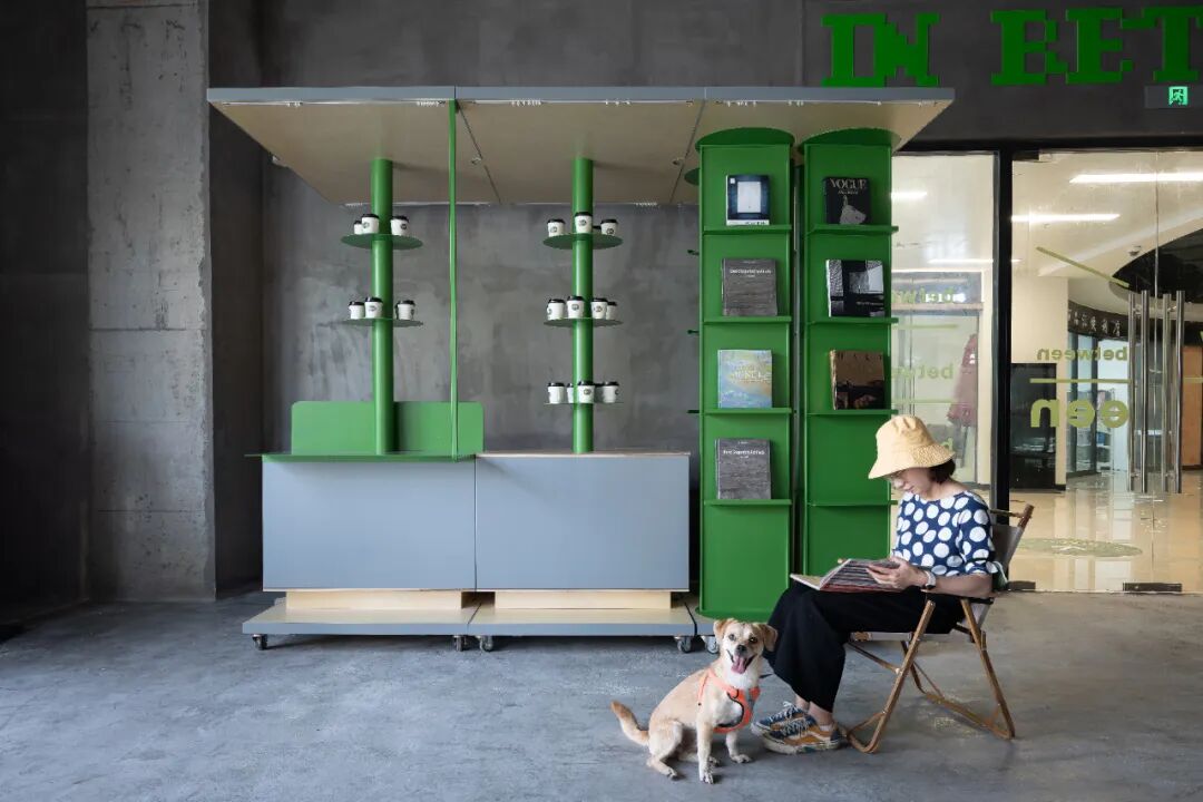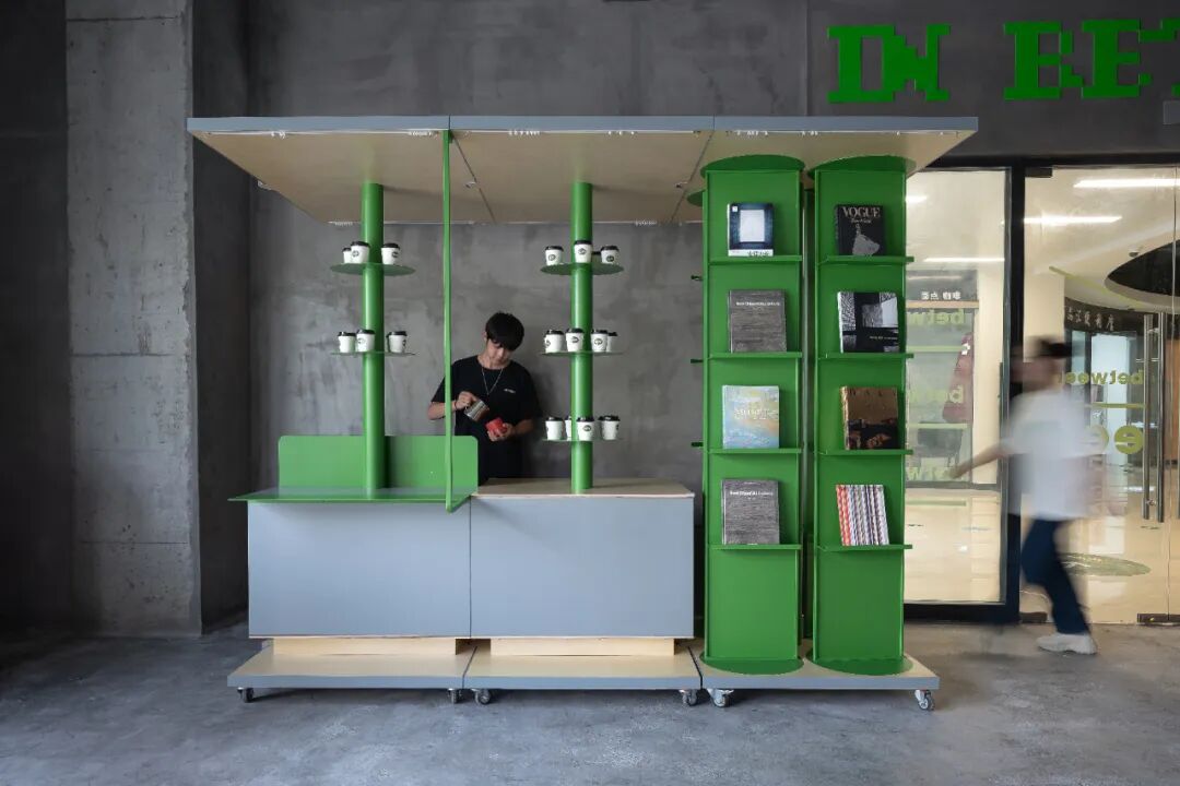 推车独立分拆时,三组推车构成店内的艺术书吧,咖啡制作台与周边产品零售区。推车拼合组装时,三个平方米的连续空间则形成了一家‘集合店’的感觉。在天气良好时,店内的运营可以随时把推车推到开阔的室外空间,从而成户外的零售小档,也成了活跃周边社区氛围的一种‘城市插入式装置’。