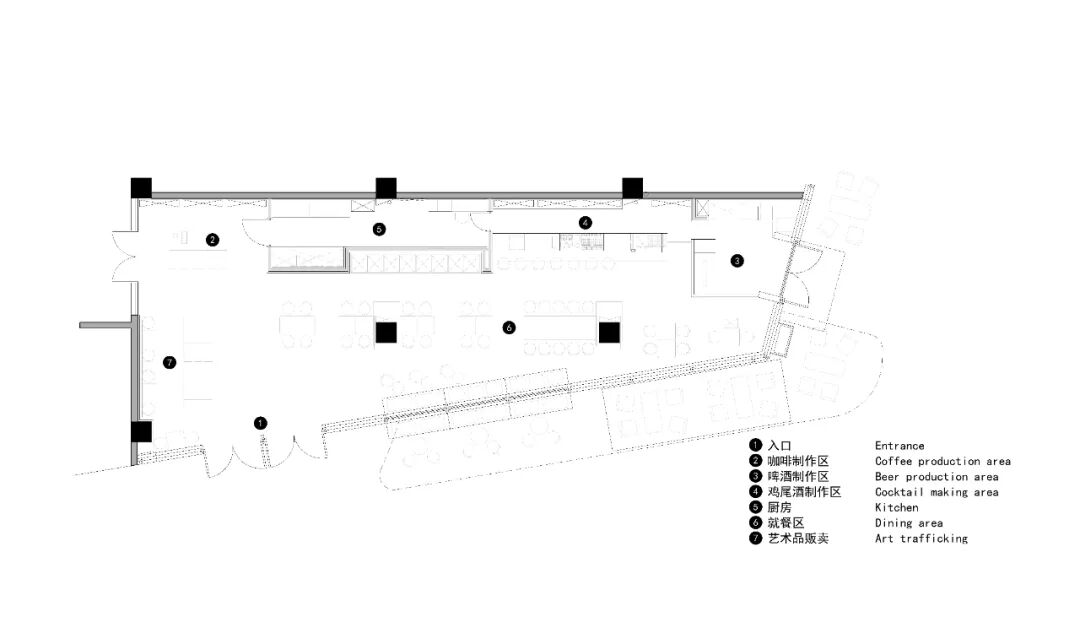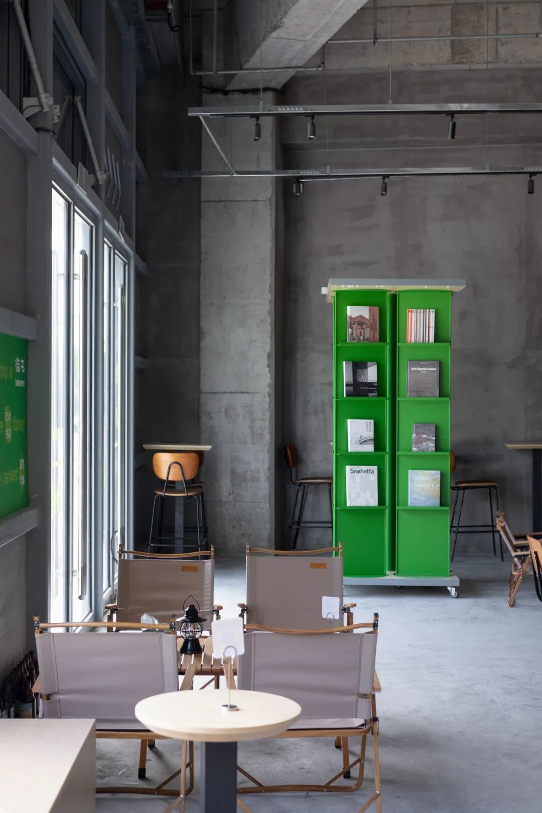 通过推拉窗的形式,暧昧化室内外的界限,打破人与人之间的物理隔阂。在室内的空间处理上,我们希望打造一个绝对简单,放松无压的室内环境,因此我们对初始的建筑结构空间采用最少的介入,保持原本空间那种粗犷,毛坯的气质,只在其中插入吧台,后厨这类必要的功能模块,剩余的空间则给到可移动的家具,满足日常客人就坐,活动举办,以及聚会预约等最大的灵活特性。